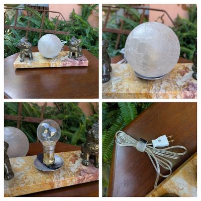 大理石のベースに愛らしい犬と猫のブロンズ像を配し、中央にはクラックルガラス(ひび模様入り)の球体シェードを備えています。点灯すると柔らかな光がガラスを透かし、温かみのある幻想的な雰囲気を演出します。