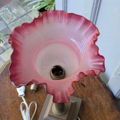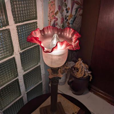 ずっしりとした真鍮製のコラム(円柱)型台座に、可憐なフリルシェードが組み合わされた、クラシカルで人気の高いスタイルの照明【45-206】