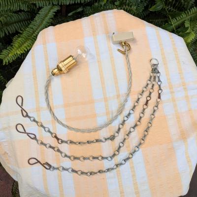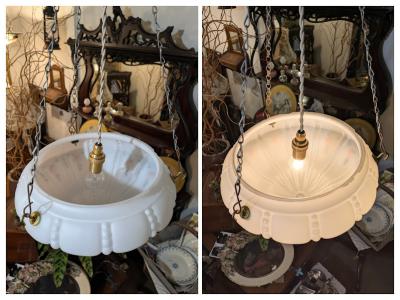優美なハンギングボウル型の吊り下げ照明は、柔らかな光で空間を包み込みます。金属チェーンは使い込まれた錆を含む当時のスタイルを保ち、口金やコードは日本仕様に変更済みのため、国内でそのまま安心してお使いいただけます。3本のチェーンを引っ掛けるだけのシンプルな構造は、初めてアンティークの照明をご利用の方にも簡単です。