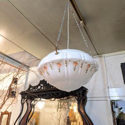 乳白色のガラスシェードには、ピンクローズに手書きの葉っぱが丁寧にあしらわれた愛らしいハンギングシェード【45-259】