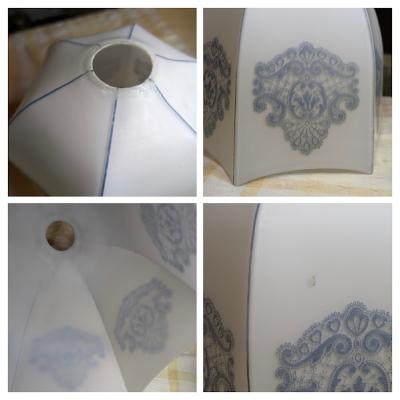 シェードは六面体のやわらかなカーブを描く形状で、各面にはブルーグレー調のクラシックな装飾模様が入っており、20世紀初頭(おそらく1920~1940年代頃)のヨーロッパデザインを思わせます。エレガントでありながらも温かみを感じさせるデザインが特徴です。シェードの穴の付近にわずかなカケが見られますが、金具で隠れますので見えません。内側、側面に製造時に混入した黒い点や気泡を含みます。