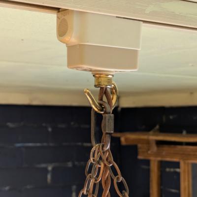 重なりあった模様が大変美しく、点灯すると優しい光が広がり、空間をふんわりと包み込みます。ヨーロッパで広く使われた3点チェーン吊りのクラシックなスタイルで、アンティークらしい雰囲気がしっかりと感じられる一品です。小ぶりなサイズ感はいろいろな場所で活躍できそうです。