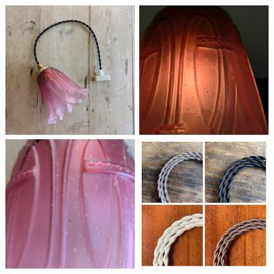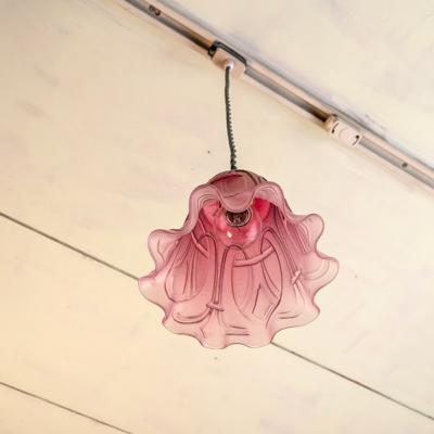 貴重なクランベリーガラスを思わせる上品なピンクのグラデーション。下部が波打つフリル状で、チューリップが開いたような優美なフォルムで 植物のつるや花を模した流れるような美しいレリーフに古いガラス特有の気泡を含んでいるため、点灯時に光の陰影が浮かび上がります。