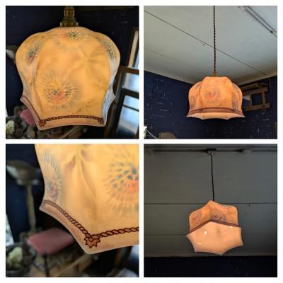 フチのロープのようなデザインは手書き、お花のように見える部分ふんわりとパステルで描いたような転写のようです。昼間に下から眺めると、うっすらと模様が透けて見え灯りがなくても十分楽しめます。優しい色使いがすっと部屋に馴染む印象です。