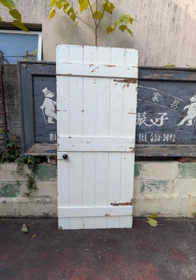 白くペイントされた木製ドアは、経年によるペイントの剥がれや小傷から、長く使い込まれてきた英国アンティークならではの味わいがあります。厚み約1.5cmと軽量で、イギリスでは室内の間仕切りや収納、サービスドアなどに使われていたタイプとのこと。