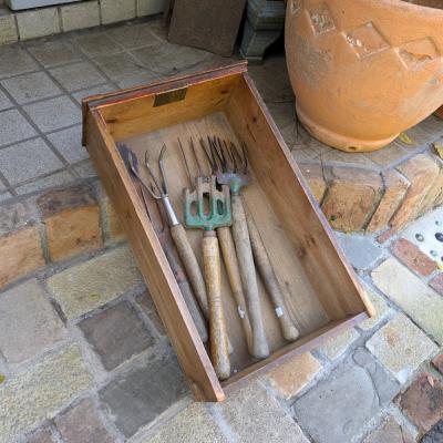 サイズはすべてバラバラのため、高さを変えて重ねたり、あえてラフに積み上げたりと、ディスプレイ次第で表情が大きく変わります。店舗什器としての見せる収納、アクセサリーや小物の整理、撮影用の背景小道具、ガーデンやアトリエの演出など、アイデア次第で幅広く活躍します。アンティークならではの雰囲気を、ディスプレイや収納に取り入れてみてください。