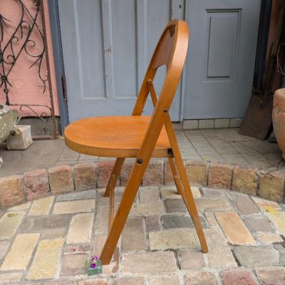 半円状の背板や軽快な折り畳み構造など、イタリアのTricチェアを思わせる洗練されたモダンデザインで、当時は西欧向けに輸出され、教会や集会所、地域のホールなどヨーロッパの日常の中で実際に使われてきた一脚です。