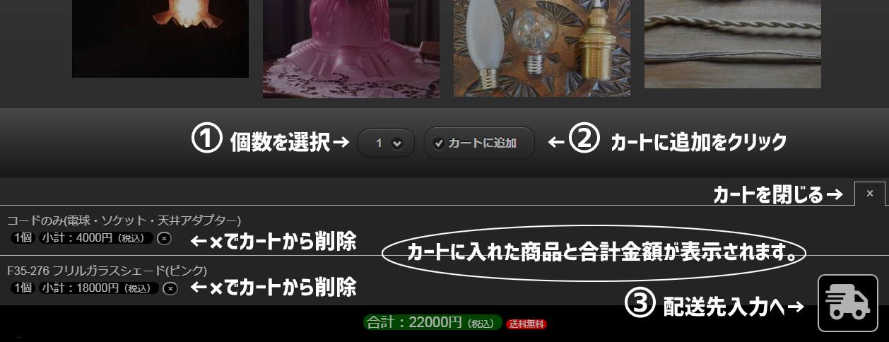 各商品ページにあるカートに追加ボタンよりカートに商品が入ります。画面下部に表示されるカート操作画面よりカート内の商品一覧・商品の削除、配送先の入力ページへ移動できます。配送先等をご入力後、商品のご注文完了となります。