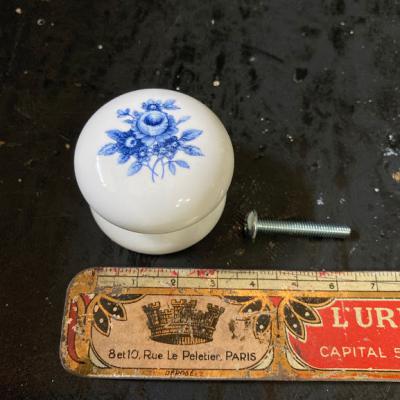 陶器のつまみ(小サイズ)です。こちらはアンティークではなく新しい商品となりますが、陶器の白地に青色で描かれたヨーロッパらしいお花の模様が可愛らしい商品です。家具そのものを変えるのは大変ですが、つまみを変えるだけで印象がずいぶん変わってきます。お手軽なイメージチェンジにご利用ください。複数個在庫がございますが、福岡市南区の店舗にてお渡しも出来ますのでお気軽にどうぞ!ゆうパック60サイズにてお届けいたします。