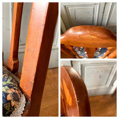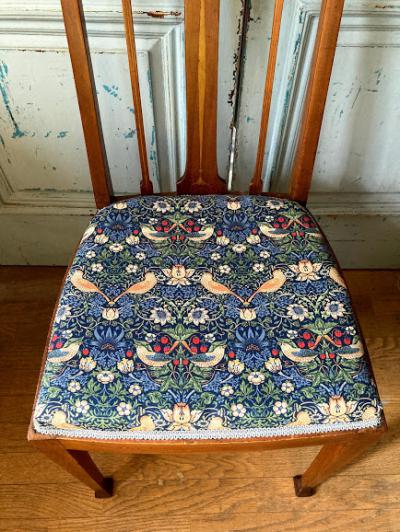 インレイド(象嵌)が美しいマホガニーの椅子です。座面にダメージが大きかったため人気のウイリアムモリス「いちご泥棒」へと張替えました。表面ばかりでなくベルト・クッションも交換しておりますので、安心してご利用いただけると思います。脚や背もたれの部分には小さな傷や凹みがございます。