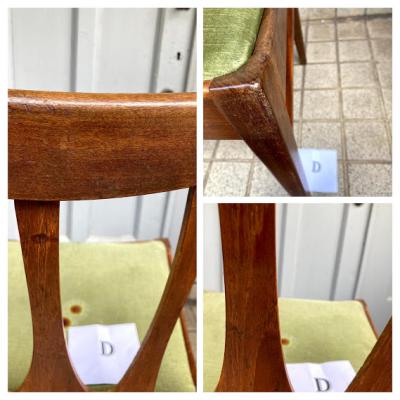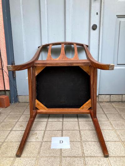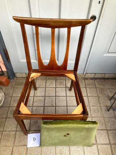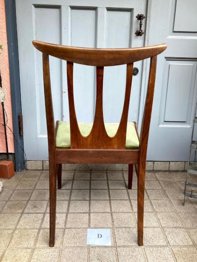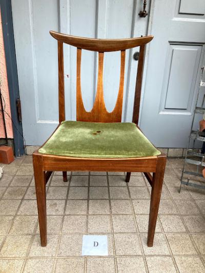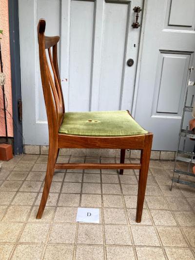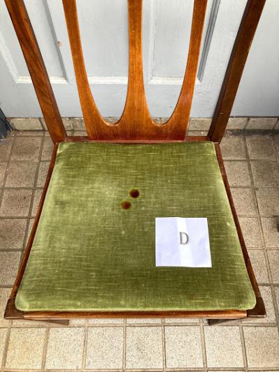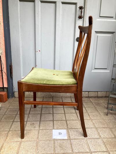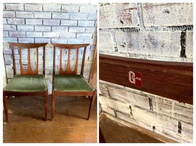 シンプルなデザインが人気のG-PLANのダイニングチェア(D)です。写真で確認出来るとおり座面部分に焦げがあるためお求めやすい価格になりました。なお、座面はスッポリと外れるタイプでちょっとしたDIYを行う方なら簡単に交換できますのでご安心ください。腰掛ける部分が広く、高さもやや低めの約43㎝ほどで作ってあるためゆっくりと腰掛けられます。この座面のグリーンはオリジナルのままのものですので多少の使用感はございます。こちらの椅子にはG-PLANのステッカーは付属しておりませんでしたが、セットで購入した商品と同じものであると確認しております。(写真のシールは確認のために別の商品の物を使用しています。)すっきりとしたデザインはどんなお部屋にも合いそうですね。古いお品のため小さな傷などはございます。これらも含めた時代を感じる雰囲気をお楽しみいただける方におすすめです。グラつきなどは調整済みのため安心してお使いいただけますよ。この商品は1点のみでの梱包しかできません。同梱不可商品です。
