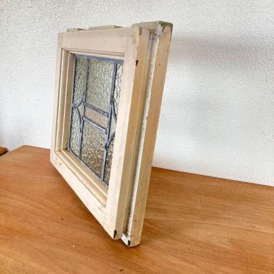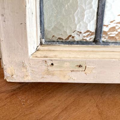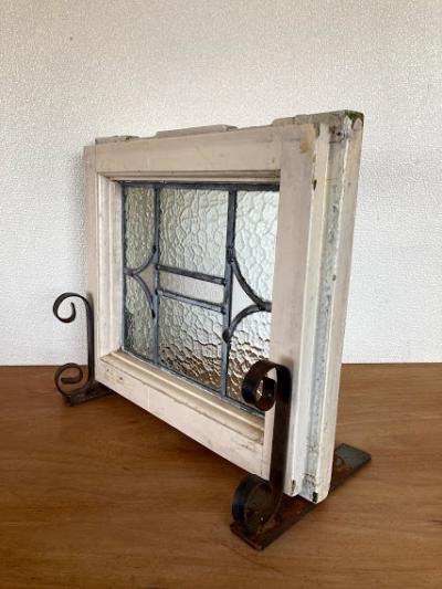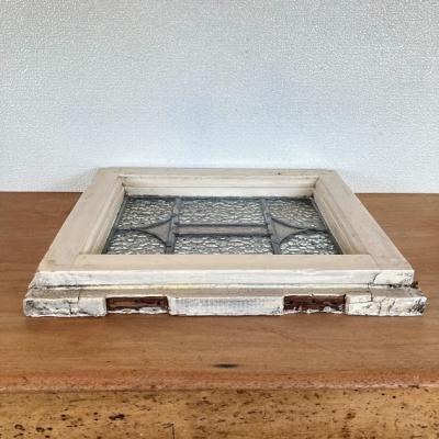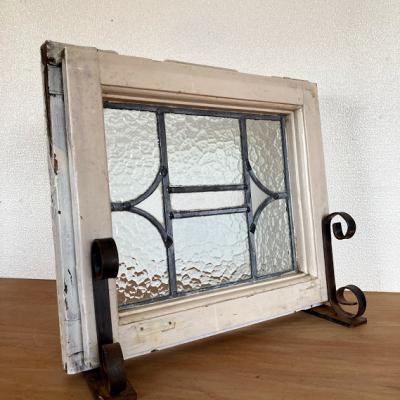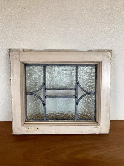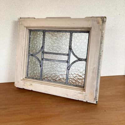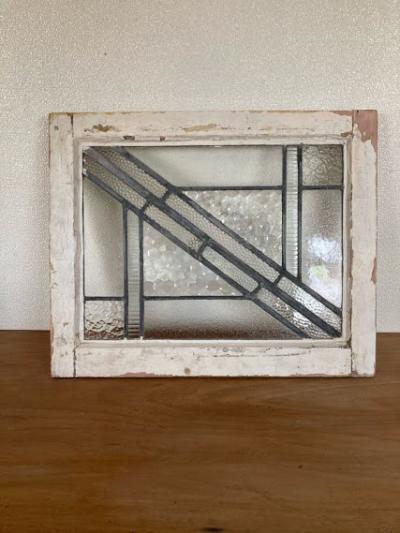 小ぶりなサイズのカラーレスガラス(透明ガラス)です。まるで矢印のようなモチーフが面白い柄です。光は通しますがガラスの模様で中が完全には見えないのでプライバシーの保護にもいいですね。このまま窓辺に立てかけたり、ドアや壁にはめ込んでも素敵ですよ。周りの木枠は当時のままの状態ですのでペンキはポロポロと剥がれ落ちる場合があります。ガラスに大きな割れはありませんが、古いお品のため経年劣化による小さな傷などはございます。枠の交換などは行っておりませんので、壁や窓などに取り付けをお考えの方はご自身の契約されている施工業者さまにご相談ください。