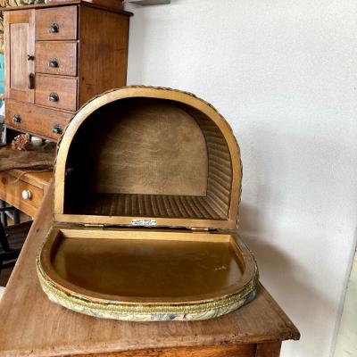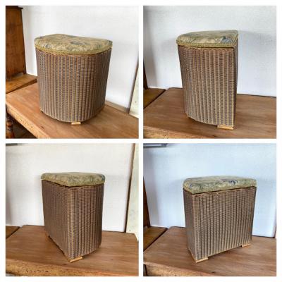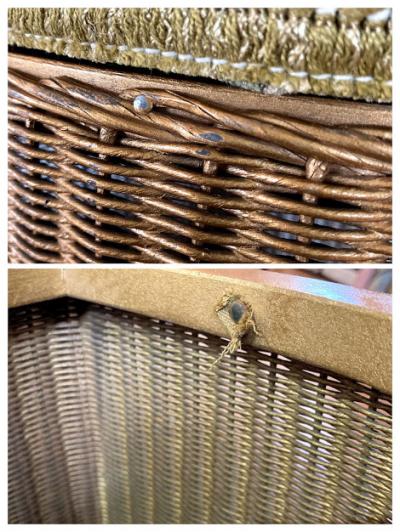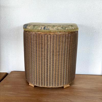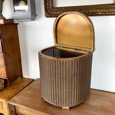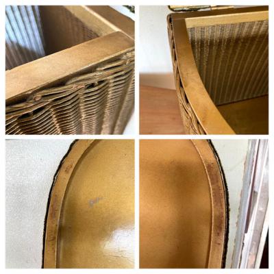 半円形ゴールドのロイドルームです。上のクッション部分にダメージが大きかったためクッションと表面の生地はウイリアムモリスのアネモネに張替えました。この部分以外は現地のままとなります。中の蓋を固定するチェーンはありませんでした。側面と蓋の内側にはペンキの剥がれや小さな傷があります。しっかりと収納もできる作りとなっていますので、玄関にスリッパを保管しつつ、靴を履く際の椅子として、リビングなどで小物をまとめるのにもいいですね。落ち着いたゴールドはどのお部屋にも馴染みそうです。推定1950年代のお品となりますので、小さな傷なども含めお楽しみいただける方におすすめです。