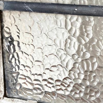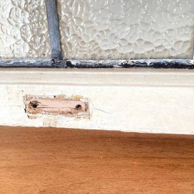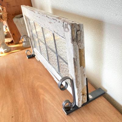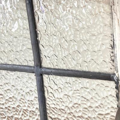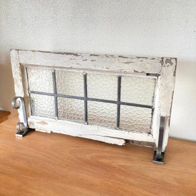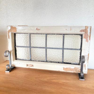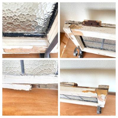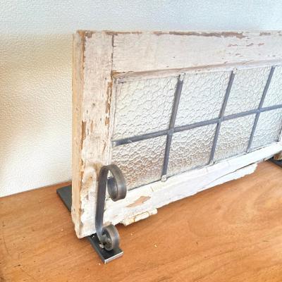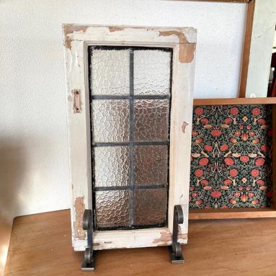 凹凸のガラスをはめこんだ窓枠。キラキラとした光は通しますがガラスの凹凸で中が完全には見えないのでプライバシーの保護にもいいですね。このまま窓辺に立てかけたり、ドアや壁にはめ込んでも素敵ですよ。向きは横向きで使用されていたようですが、設置場所によっては縦でもご利用できます。周りの木枠は当時のままの状態ですのでペンキがポロポロと剥がれ落ちます。蝶番は片方のみ、木枠には一部割れなどがあります。ガラスに大きな割れはありませんが、古いお品のため経年劣化による傷などは多くございます。また、ガラスの接続部分は海外のものらしいアバウトな仕上げになっていますので几帳面な方には向きません。これらの時代を感じるたたずまいなども含めた雰囲気をお楽しみいただける方にのみおすすめです。サイズの大きなものも在庫として多数あり、福岡市南区の店舗にてお渡しもできますのでお気軽にどうぞ!枠の交換などは行っておりませんので、壁や窓などに取り付けをお考えの方はご自身の契約されている施工業者さまにご相談ください。