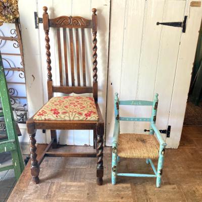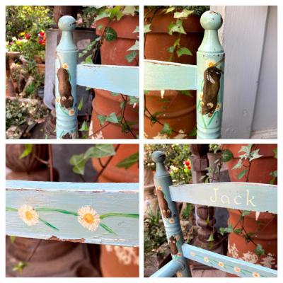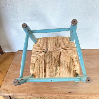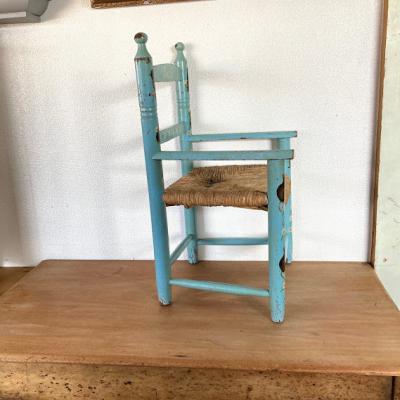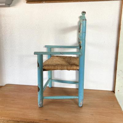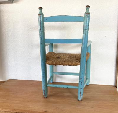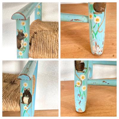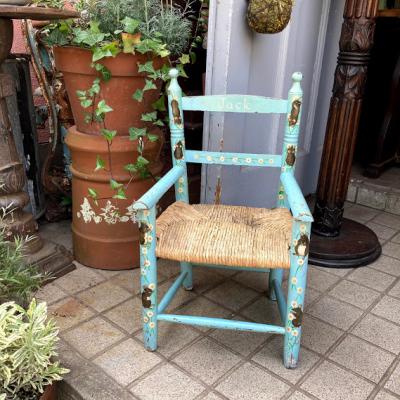 水色にペイントされた子供用の木製椅子。背もたれの部分に「Jack」と名前が入っています。前面の部分にはネズミと白い花を組み合わせた可愛らしい絵柄があり、とても癒されますね。座面は藁で、一部黒くなっている部分がありました。新しいピカピカの新しい物がお好きな方には向きません。ペイント部分は経年劣化によりペンキの剥がれがあり、うっすらと黄色く変色した部分もみられますが、これらも含めた時代を感じる雰囲気をお楽しみいただける方におすすめです。お部屋の観葉植物を飾る台や、玄関先でのちょっとした荷物置きなどにもいいですね。