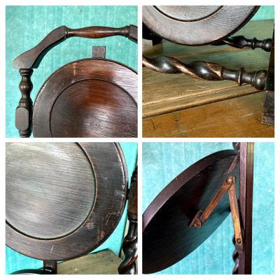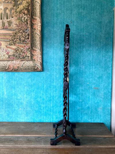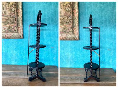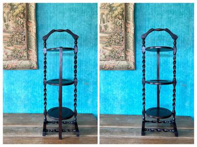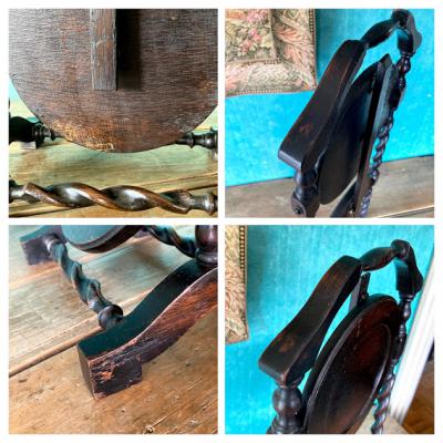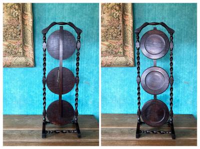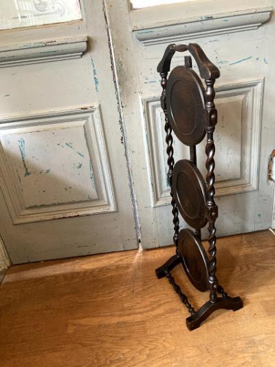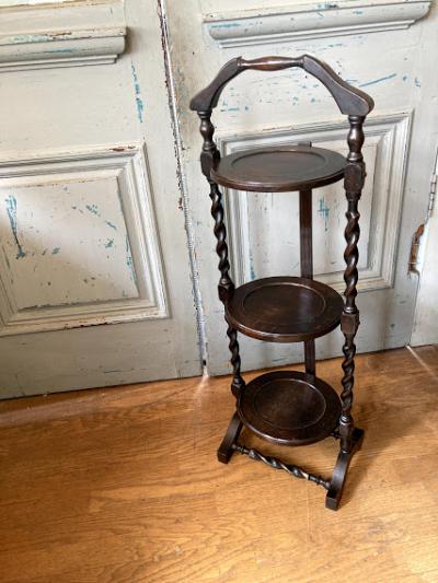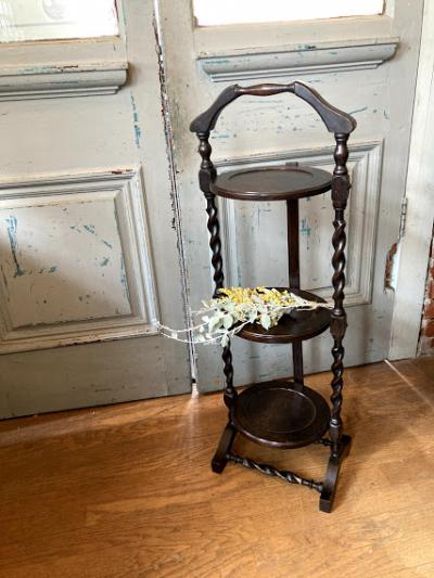 推定1930年代オーク材、ツイストレッグが美しいケーキスタンドです。使用しないときは折りたため収納も便利ですね。開閉はスムーズにできました。人から人へと大切に引き継がれてきたため表面には小さな傷や色が剥がれた部分がありますが、これらも含めた歴史を感じる雰囲気をお楽しみいただける方におすすめです。アフタヌーンティーのお供はもとより、お気に入りのカップを並べたり、観葉植物や季節のお花などを飾っても素敵ですよ。こちらは梱包資材を持ち帰ってくれて片付けが楽なヤマト家財便にて発送予定です。元払いのみとなりますので、送料金額をご確認の上お支払いをお願いいたします。
