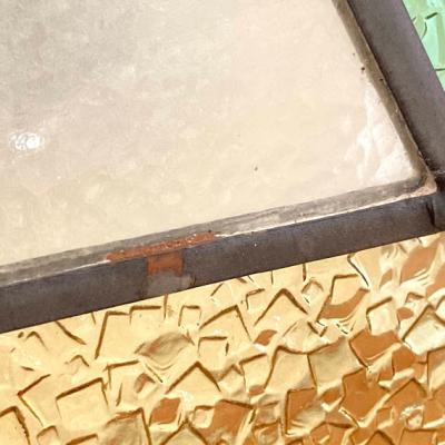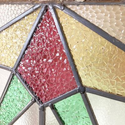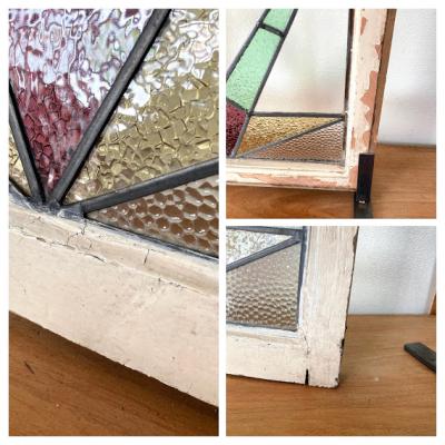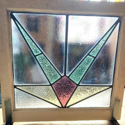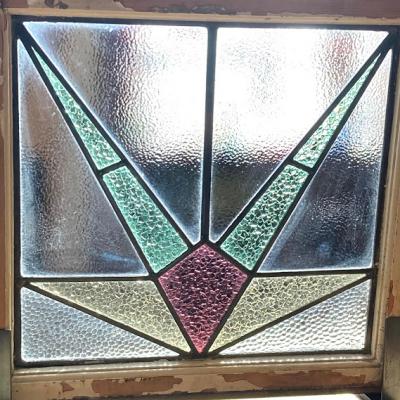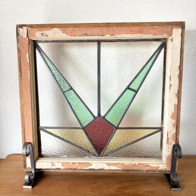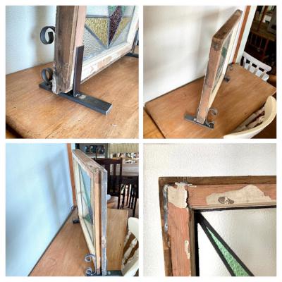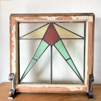 推定1930年代幾何学模様のステンドグラスです。模様の雰囲気から上下どちらでもご利用いただけるかと思います。当時のままの木枠が付属しておりますので、ペンキの剥がれ、木枠に傷等ございます。片面は凸凹のガラスで光を通すとキラキラと反射してとても綺麗ですよ。中の様子はくっきりとは見えませんのでプライバシーの保護にもなりますね。ガラスの部分に大きな割れなどはありませんでした。細かな傷等につきましては画像をご確認ください。古い時代を感じる雰囲気を楽しめる方におすすめです。新しい物がお好きな方はご遠慮ください。そのまま飾るだけでなく、壁面やドアなどに取り付けなどをお考えの場合はご自身の契約されている施工業者さまにご相談ください。破損を考慮して木枠の取り外し等は行っておりません。発送時は両面をベニヤで補強してのお届けとなります。割れ物のため運送保険に必ず加入しますが、保険料は当店負担にてお付けしておりますのでご安心ください。(着払いをご利用の場合は保険料はお客様ご負担となります。ご注意ください。)全体的に出来るだけクリーニングを行って発送いたしますが、古いお品のため落ちきれない汚れが残る場合がございます。