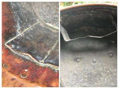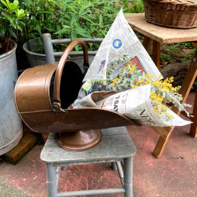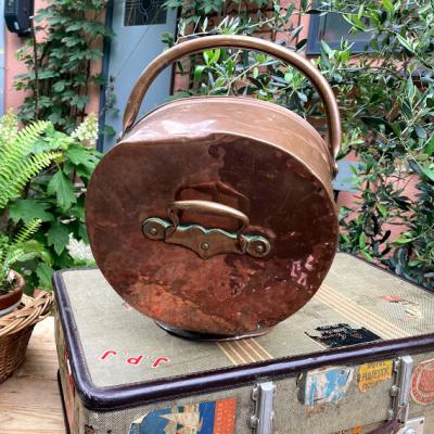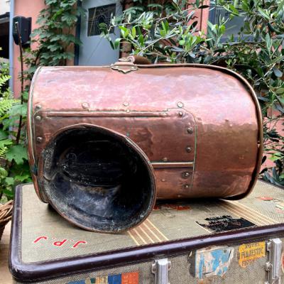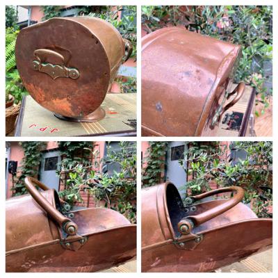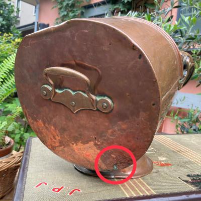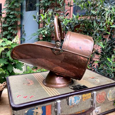大きな銅の石炭入れです。年代は不詳とのこと。石炭は生活に欠かせない大切な燃料として専用の入れ物が作られ、厨房や暖炉の傍らで長い間使用されてきました。現在ではこのレトロな佇まいを生かして、ドライフラワーや玄関先のスリッパ入れ、リビングで雑誌を入れたりと、アイデア次第で面白い使い方ができるかと思います。実際に使用されていたので、内部は黒ずみ、すすが手に付く場合があります。研磨剤や専用クリーナーで磨くこともできますが、店舗ではあえ水拭きのみでレトロな雰囲気を残して仕上げてあります。ある程度は拭き取ってありますが、強くこすると黒く汚れが付く場合がありますのでご利用の前にご確認ください。上部の取っ手は可動式。背面の取っ手は固定されています。一番奥の赤い丸で囲った部分は小さく穴が開いています。(左右に30mmほど裂けている感じです。下の方なので側面から見た場合はあまり目立ちません。)水漏れしますので、もし生花を飾る際には、中に花瓶などを入れてご使用ください。側面には凹みや傷、緑青部分もあります。古いものが好き!ジャンクな物に魅力を感じる方におすすめです。
