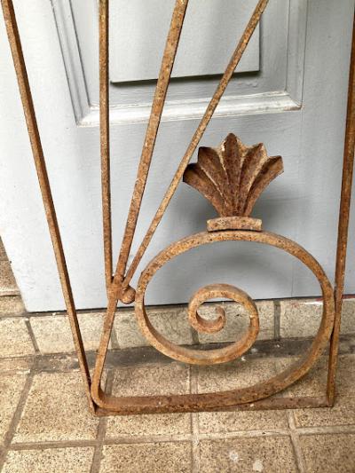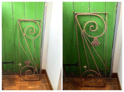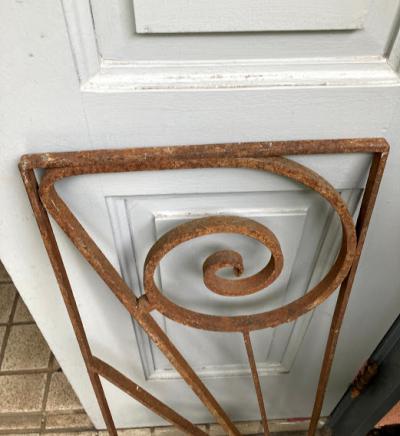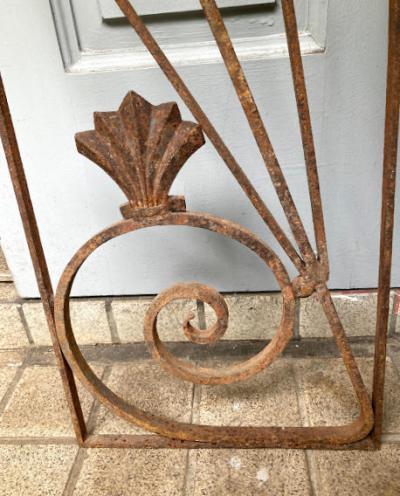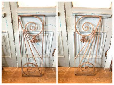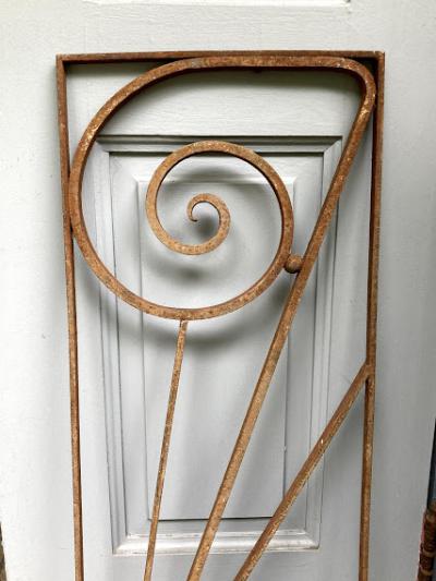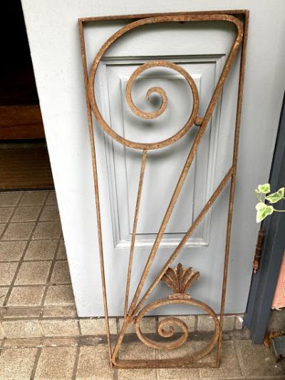 推定1930年代のアイアンパーツです。古き良き時代にドアにはめ込まれて使用されていたと聞いています。映画などで出てくる古いお屋敷に取り付けてあるような曲線と貝殻のようなモチーフを組み合わせたようなデザイン。お部屋やガーデンのアクセントにピッタリのお品です。上下どちらの向きでも楽しめますね。取り付けに使えそうな穴は1か所のみありました。リフォームなどお考えの方には壁や窓に取り付けても素敵。こちらは1枚のみとなります。ご覧いただける通りサビで包まれておりますので、この雰囲気が好き!古いものが好き!サビに魅力を感じる方におすすめです。