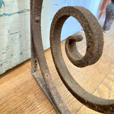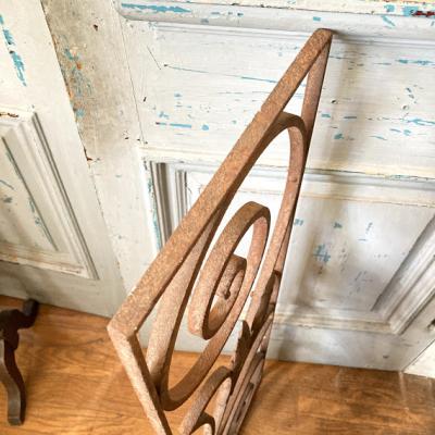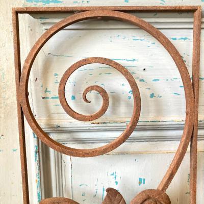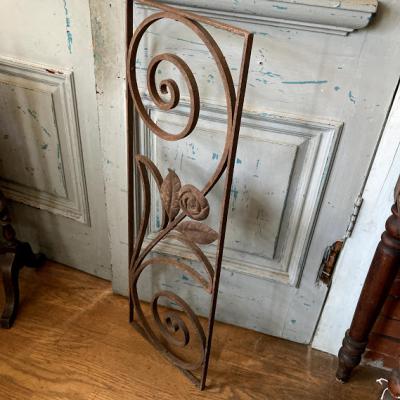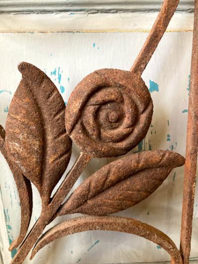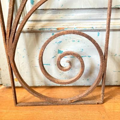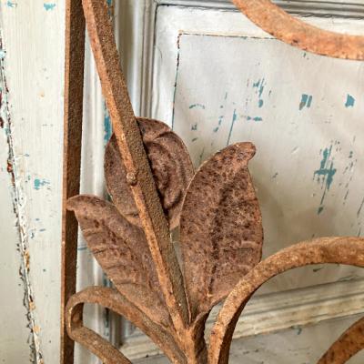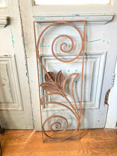 推定1930年代のアイアンパーツです。古き良き時代にドアにはめ込まれて使用されていたと聞いています。ディズニー映画などで出てくる古いお屋敷に取り付けてあるようなデザイン。お部屋やガーデンのアクセントにピッタリのお品です。お庭でグリーンとの相性は◎ですが、リフォームなどお考えの方には壁や窓に取り付けても素敵ですね。画像の通りサビで包まれておりますので、古いこの雰囲気が好き!サビが好き!という方にのみおすすめです。新品をお求めの方はご遠慮ください。こちらは在庫1枚のみとなります。取り付け用の穴のようなものはありませんでした。