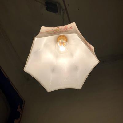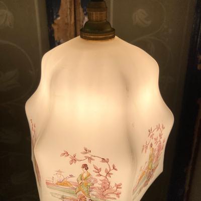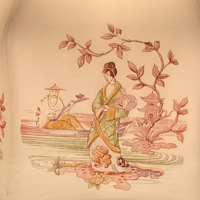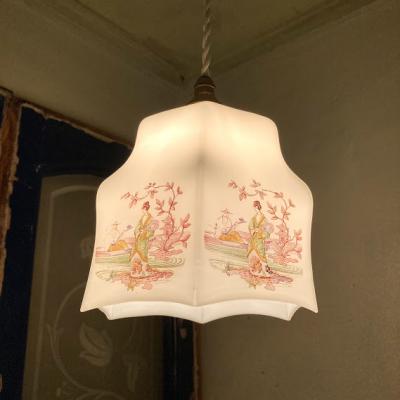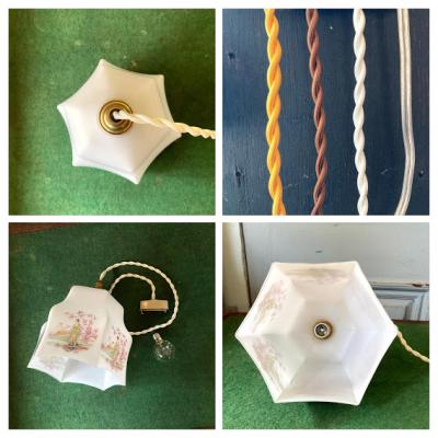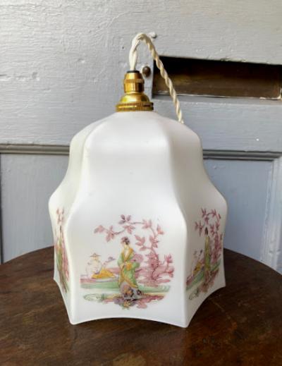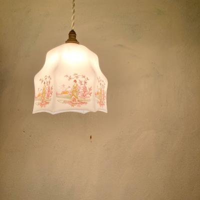 着物をまとい優雅にたたずむ女性を描いたオリエンタルな雰囲気の照明です。フチの部分は六角形をベースに作られているようですが、上方向に曲線を描いており非常に柔らかい雰囲気です。欧州ではこのような東洋を感じるデザインが人気だったそうです。年代は不詳とのこと。6面すべて同じ絵柄ではございますが、古いお品のため左手の男性の絵柄が少し消えかかっている部分や、側面のカーブした部分に黒い小さな汚れが付着しています。こちらは水拭きしても消えませんでした。照明用の口金はサイズE17でLED電球にも対応しています。付属のコードは長さゴールド・ホワイト・ブラウン・クリア(ビニール)の4色よりお選びいただけます。1mまでは無料で調整いたしますが、1mを超えるものにつきましては別途料金が発生しますので事前にお問合せください。お客様よりコードの色、長さのご希望がない場合は撮影に使用した状態(コード色:ホワイト/長さ約50㎝)にてお届けいたします。