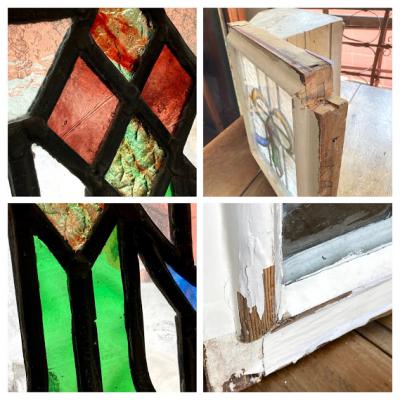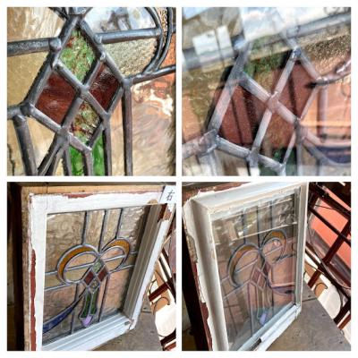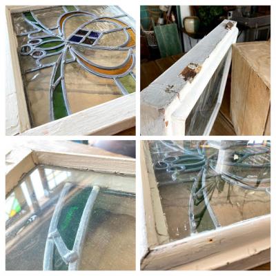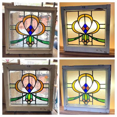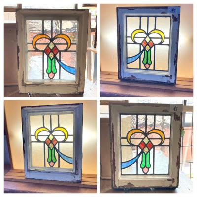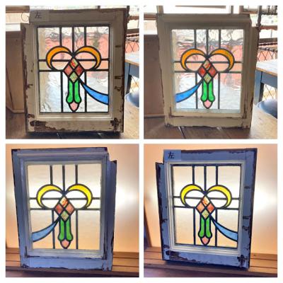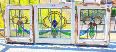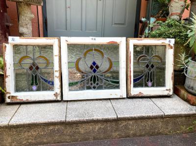 3つのデザインが組み合わされたステンドガラス3枚セットです。(左+中央+右)通常のステンドガラスと違い、片面外側にあたる部分にはフラットの透明ガラスがはめ込まれ2重ガラスになっています。写真では分かりづらいかもしれませんが、3枚とも片面は凸凹、もう片方はつるつるです。つるつるした面の中は空洞になっていますが、取り外しができないため少しホコリが入っています。サイズは小さめですが、ガラス1枚分の重量が加算されるため若干重さを感じます。そのまま飾る以外に窓枠や壁面の装飾などにお考えの場合はご自身の契約されている施工業者さまにご相談ください。古いお品のためガラス内部には気泡が含まれ、光が差すとキラキラと反射してとても綺麗です。ガラス面に大きな割れなどはありませんが、外側の木枠にはペンキの剥がれ、パテ外れ、傷などがあります。左側にあたる木枠の角は1部カットされています。中央上部の蝶番は1つありません。古い雰囲気のガラスが好き!店舗のイメージを変えてみたい!ドアや壁にはめ込んで楽しみたい!方におすすめ。ピカピカの新品をお求めの方はご遠慮ください。