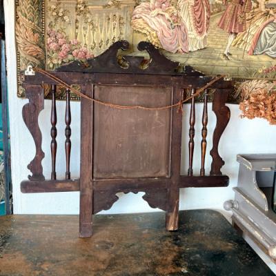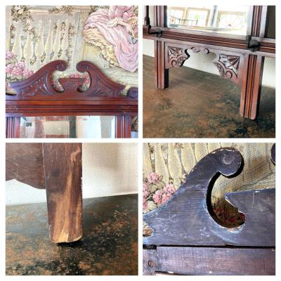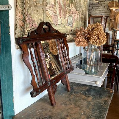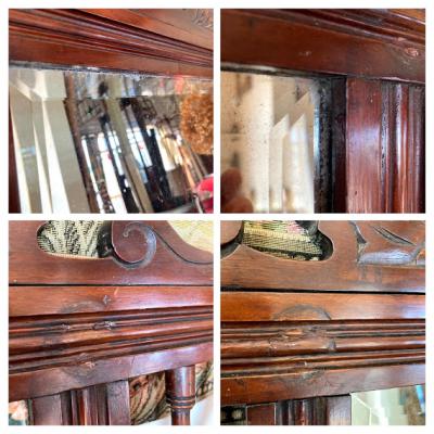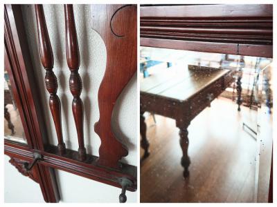 フック付きウオールミラー。古い味のある短いフック4本と長いフック2本が付ついています。店舗什器や室内でデイスプレイなどにもおすすめです。経年により木部に擦り傷やパテ埋めの跡、ミラーに擦り傷やシミがあります。マホガニーで推定1920年代とのこと。クラシックな雰囲気がお好きな方向き。