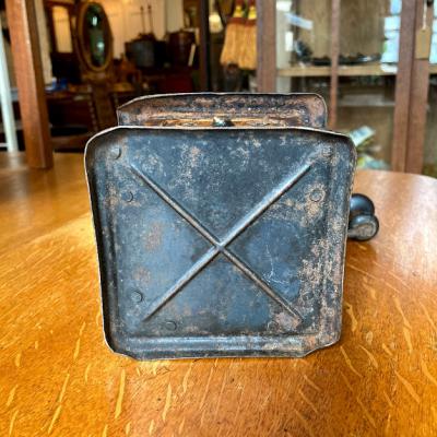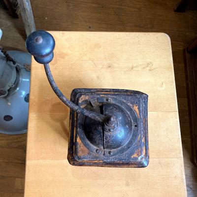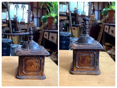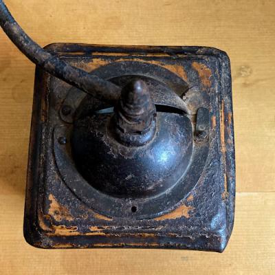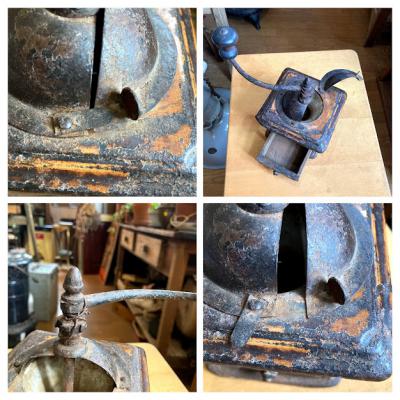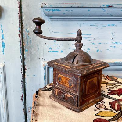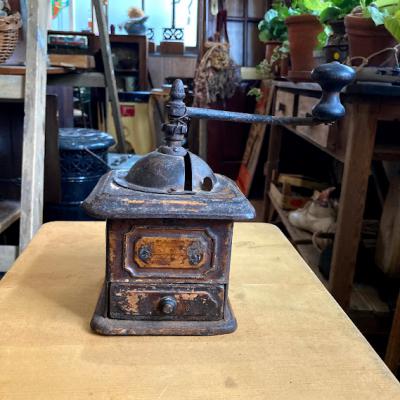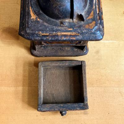アイアン製の小ぶりなコーヒーミルです。ハンドルはくるくると回りますが、ご覧いただける通りサビや塗装の剥がれなどに包まれているため実際に豆がひけるかの確認は行っておりません。あくまでもディスプレイ用としてお楽しみください。正面についている小さな引き出しの部分は木製です。ショップカードなどを入れても素敵ですね。上部の釘は一つ外れてありませんでした。この朽ちた雰囲気が好き!サビが好き!古道具が好き!な方にのみおすすめ。