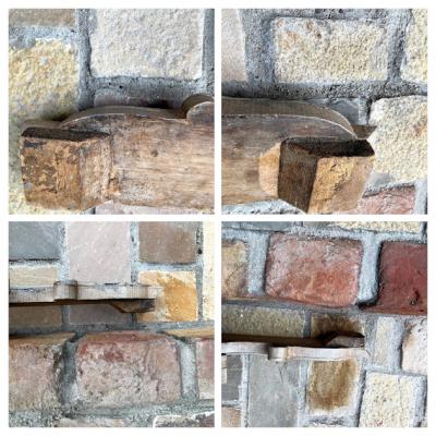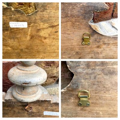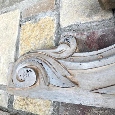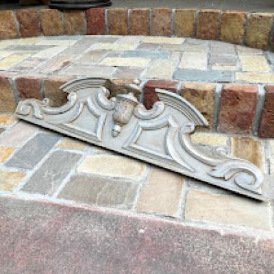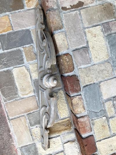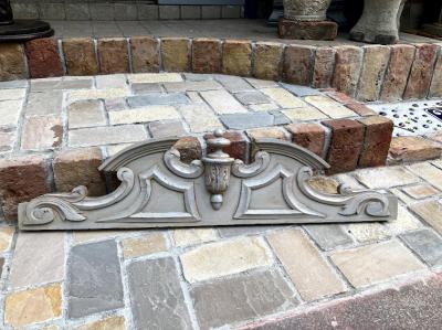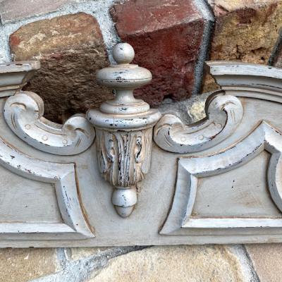フランス1880年代の家具などに使用されていた装飾用のパーツです。繊細なデザインで明るめのブルーグレイな色味がフランスらしい雰囲気と漂わせています。大きめの家具の上に固定したり、壁面飾り、お部屋のアクセントとして観葉植物と一緒に窓辺のインテリアなどにもいいですね。裏面に現地の方が張り付けた年代のシール、固定用の金具(サビあり)が付属しています。金色のフックはイギリスの物で壁面に固定するために後から取り付けたものです。古いお品のためペンキの剥がれ、小さな傷、凹凸はあります。古いものを組み合わせたリフォームやリノベーションを楽しむ方、ワンランク上のお部屋作りをしている方におすすめ。