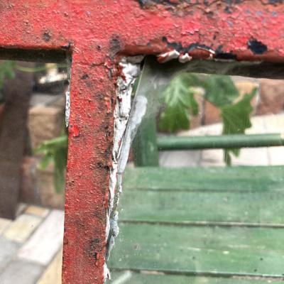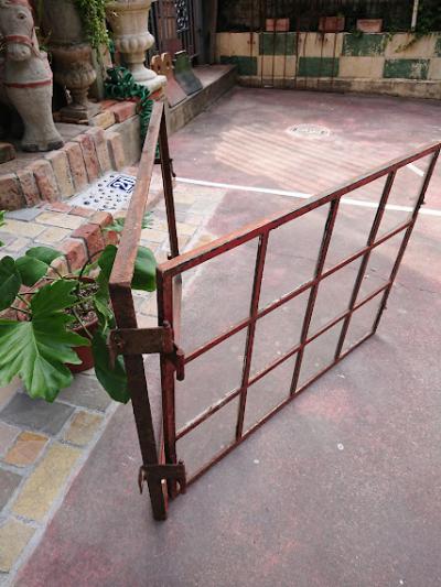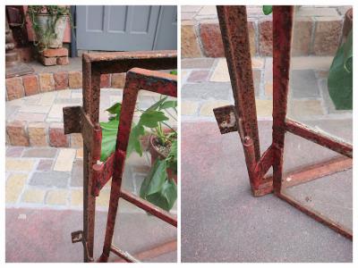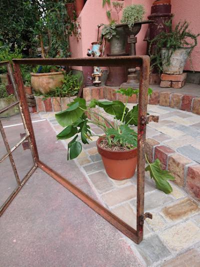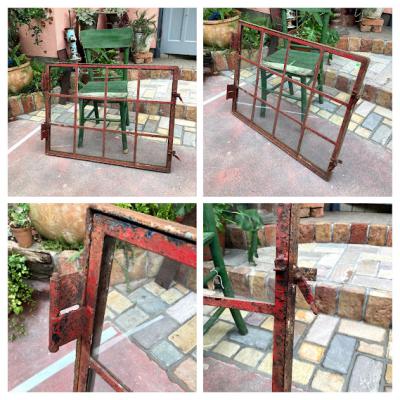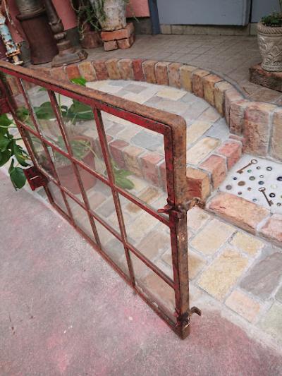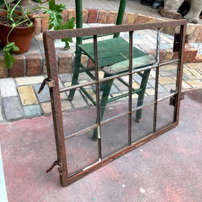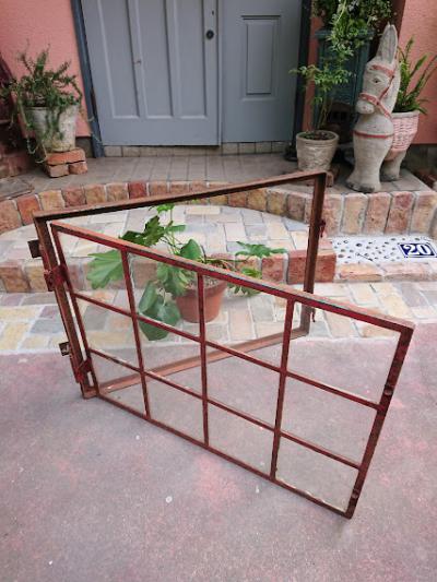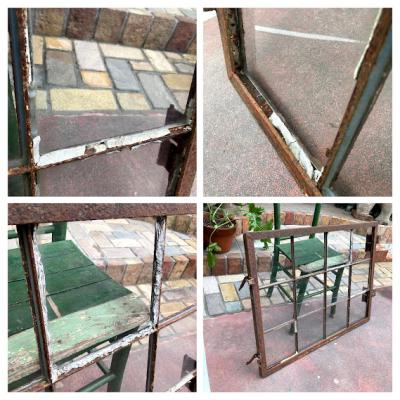 鮮やかな朱色にサビをまとい歴史を感じさせる鉄枠に、透明ガラスが入っているアイアンフレーム窓枠。 ガラスに大きな割れはありませんが、1か所だけパテが経年劣化している部分に少しカケが見られます。また全体的にパテが劣化し剥がれ落ちています。ご自身でDIYを行うことが出来る方であれば、パテを埋める作業を行うと安心かもしれません。扉を広げると上部の丁番の心棒が外れており、開閉は固くなっているため、実際に窓に取り付けてご利用されるよりは、ディスプレイの一部としてご利用されることをおすすめします。ジャンクな雰囲気がお好きな方、サビの持つ独特の雰囲気が大好きな方!向き。丁番の破損によりスムーズな開閉は出来ませんので、窓としてのご使用を希望される方は、現状でのお渡しとなるため、はめ込み式や固定式にするなどご自身の契約されている施工業者さまに相談の上ご購入ください。