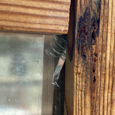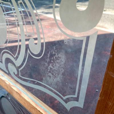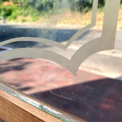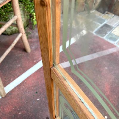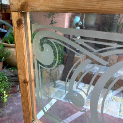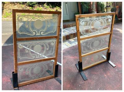 柔らかな曲線のデザインが美しいガラス3枚です。自然光も素敵ですが、明かりが灯もると美しいシルエットが浮かび上がります。パブなどで使用されてたとのことでした。周りの木枠はイギリスで輸送用に作られた簡易的な木枠が付属していますが、あくまでも輸送用のためパッキンなどでしっかりと固定されておらず、ガラスがカタカタと動きます。このまま窓枠として取り付けをご検討の方は、強度の兼ね合いもありますので、しっかりとご自身の契約されている施工業者さまにお問合せください。破損を考慮し軽く拭き上げてはおりますが、小さな傷や模様の剥がれ、真ん中のガラスの木枠との境目部分に小さなカケがございます。このガラスのもつ古い雰囲気を楽しみたい方、お店のはめ込みガラスに使用したい方などにおすすめ。