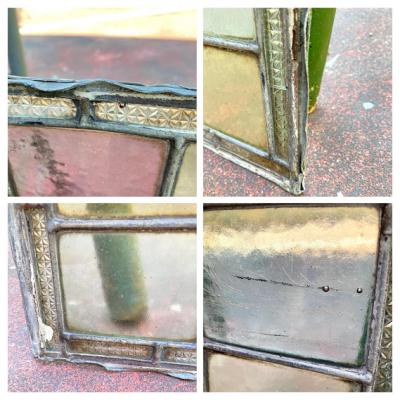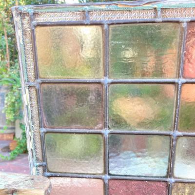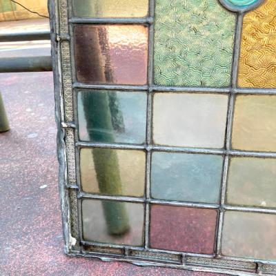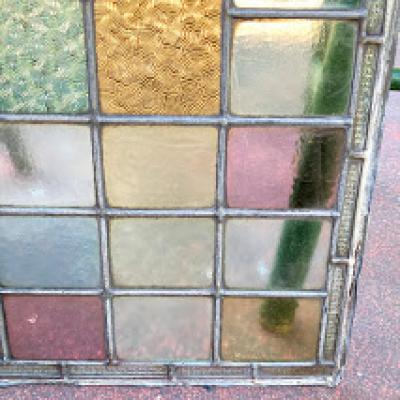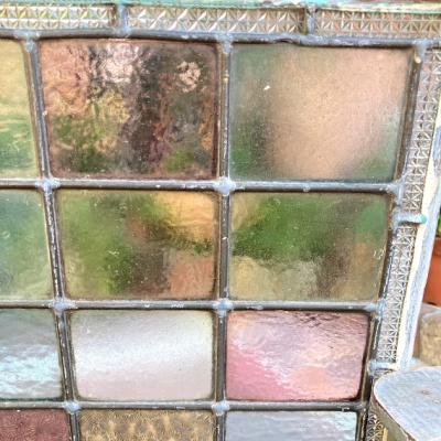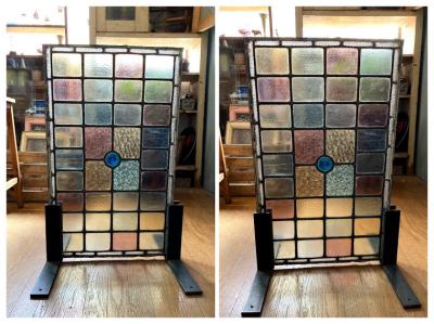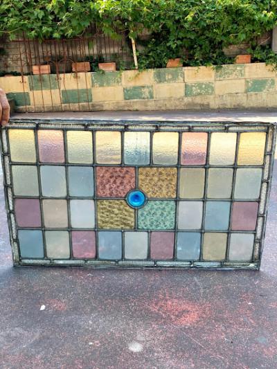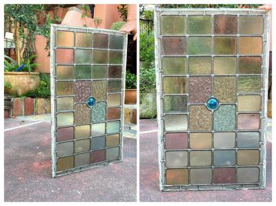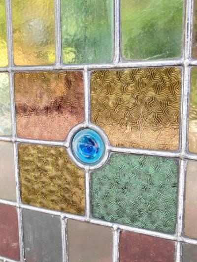 中央に鮮やかなブルーのロンデルガラスをはめ込んだ美しいステンドガラスです。木枠は付属しておらず、このままの状態でのお届けとなります。当店のお客様は風合いを残した状態がお好きなため、破損も考慮しつつ、水拭きのかんたんなクリーニングを行っております。全体的に大きな割れなどはありませんが、フチのケイムの部分は取り外した際にぐにゃっと曲がってしまった部分があります。また、古いガラスの特徴である気泡も多く含みます。緑色のガラス部分に割れのように見える部分がありますが、拡大していただくとわかる通り製造時の気泡と小さな傷だと確認できます。明るい色合いの不透明なガラスを組み合わせてあるため光は通しますが、プライバシーの保護にもいいですね。デザインは縦でも横でも大丈夫そうです。壁などに取り付けをお考えの方はご自身の契約している施工業者さまにお問合せください。発送は両面を大きめのベニヤ等で挟んで梱包する方法となります。美しいガラスをお探しの方、お部屋のイメージを一新したい方、目隠しのガラスをお探しの方におすすめ。