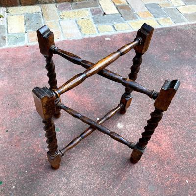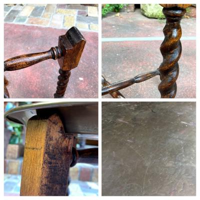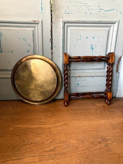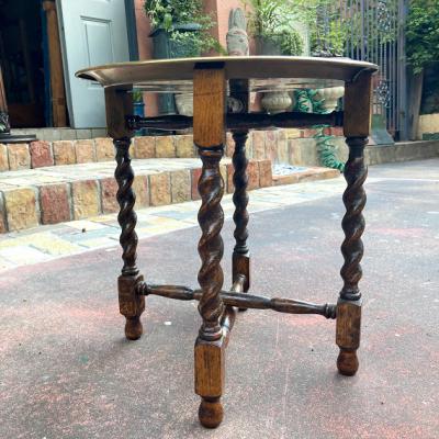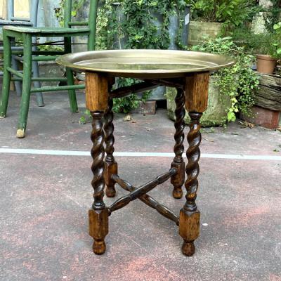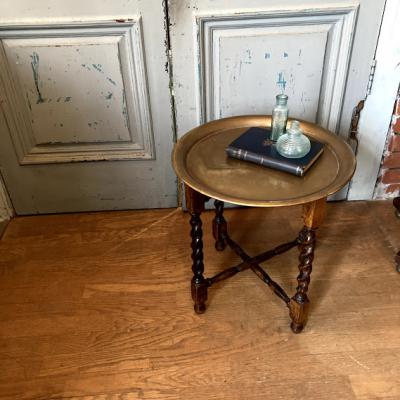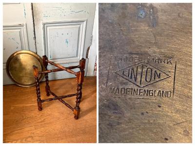 裏面にイギリスではおなじみのTRADE MARK LINTONのロゴが入った折り畳みができるテーブルです。脚はツイストレッグでクラシカルな印象です。天板が脚部分のくぼみに乗っているだけのシンプルな構造なので、どこへでも移動ができ、折り畳むと脚は約8㎝ほどの厚みになりますので収納にも便利ですね。構造上あまり重いものはおすすめできません。ちょっとしたディスプレイや、ベッドサイドやソファ横のテーブルとして、観賞植物の台などに。取り外した天板は大きめのトレイとしても使えます。(直径43㎝ほど)古いお品のため天板や脚に小さな傷や凹凸、裏面に緑青のような部分があります。お部屋の小さなスペースに展示台が欲しい方、お客様の来訪時に一時的なテーブルとしてご利用したい方などにおすすめ。