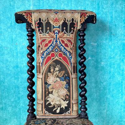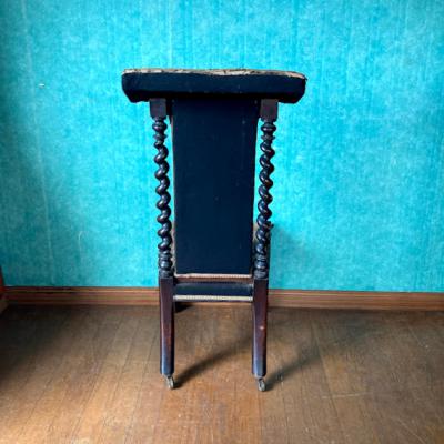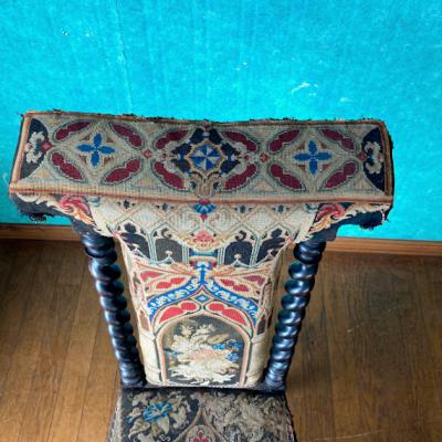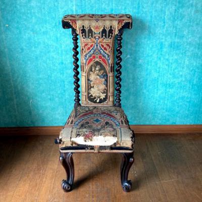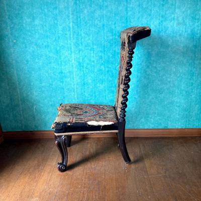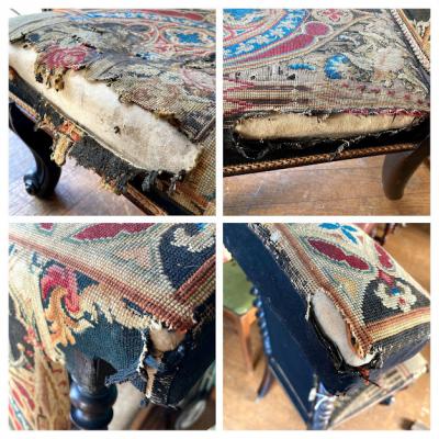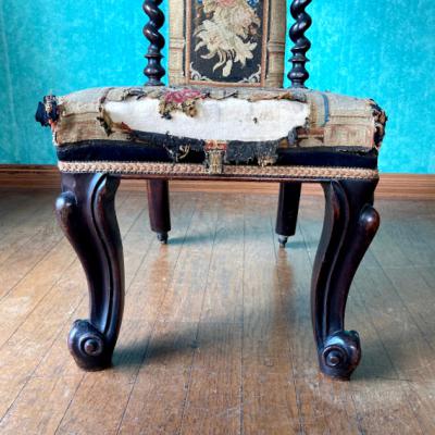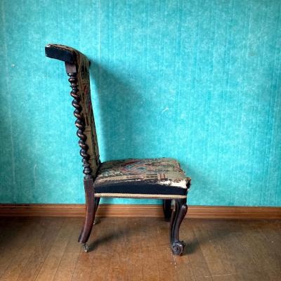 まず目に付く生地の破れや、背もたれ部分にはガタツキがありましたが、手作業の刺繍のデザインが非常に美しく、全体的な印象に惹かれ買い付けました。フランス製で祈祷用の椅子として製造されたものとのこと。座面が低く作られているため授乳用のナーシングチェアとしても使用されていたのではと聞いております。本来ならばベースとなる部分全体を調整し、生地の張替えなどを行うレベルではありましたが、せっかくの美しい刺繍をオリジナルの状態のまま保ちたかったため、何もしておりません。ダメージを考慮して眺めて楽しむ展示用としてのご利用をお勧めします。もしも実際のご利用をお考えの場合は、椅子修理専門の業者さまにお問合せください。推定1830年代とのこと。現状のままでのお渡しとなりますので、古いものにご理解のある方にのみおすすめします。