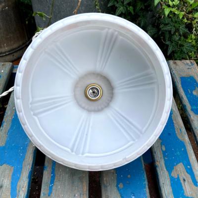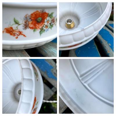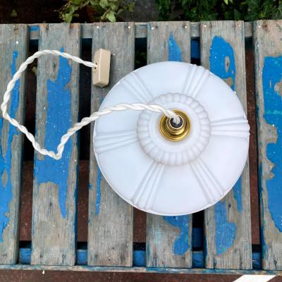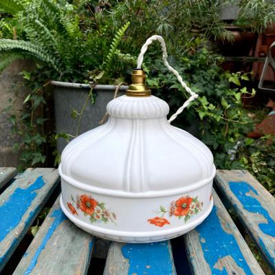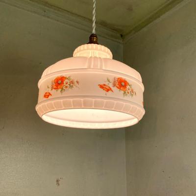 白いマットなガラスに可愛らしいポピーを描いたガラスシェード。口金はネジ式のE17に変更しておりますので、ホームセンターや家電量販店でお好きな電球へと交換が可能です。LED電球にも対応。撮影時には白いボール球(25W:電球色)を使用しております。電球の色が変わるとまた雰囲気もかわります。大きな割れなどはありませんが、ガラスシェードは推定1940年代のものですので小さな傷や拭いても落ちない汚れ、お花の模様が一部剥がれているなどがございます。長い時代を過ごしてきたお品の風合いとしてお楽しみいただければと思います。照明用コードセットが付属しますので、商品到着後はすぐにご利用ができますよ。コードの色・長さは1mまではお好きな長さに変更できます。ご希望のコードの色・長さがある場合はお知らせください。1mを超える長さにつきましては別途有料となりますのでご相談を。ご希望がない場合は、写真に使用しておりますコード【白】・長さ【約50㎝】にてお届けとなります。リラックスする照明をお探しの方!古いガラスがお好きな方!におすすめ