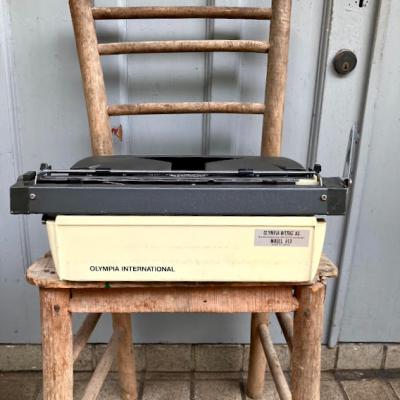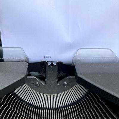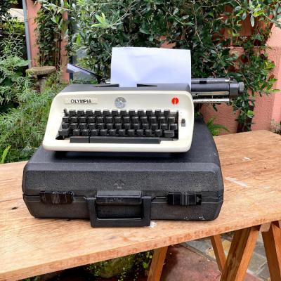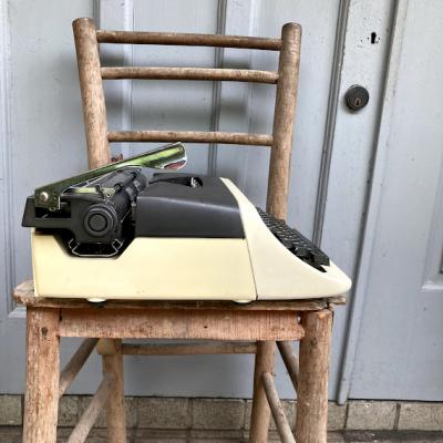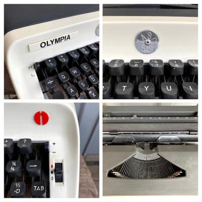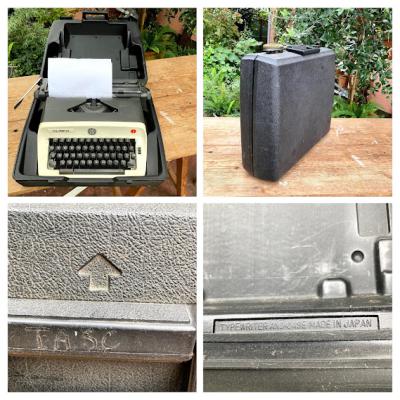 日本から輸出されていたタイプライターです。説明書はありませんでした。試しに紙を差し込み、文字を入力してみると気持ちのいい感触とともに入力ができました。現在もインターネットなどで替えのインクリボンを購入することができるようです。当店では周りの汚れを軽く拭きとるのみしておりますので、実際にレポートなどにご利用を検討中の方は専門の業者さまでのメンテナンスをおすすめします。専用のケース付属。持ち手の部分に持ち主の名前?のようなものが刻んであります。全体的に経年劣化による傷や白い部分が黄色味を帯びたような色の変化があります。お店のディスプレイなどをお探しの方!一度はタイプライターを試してみたい!方向き