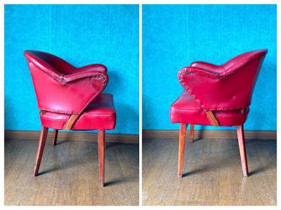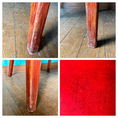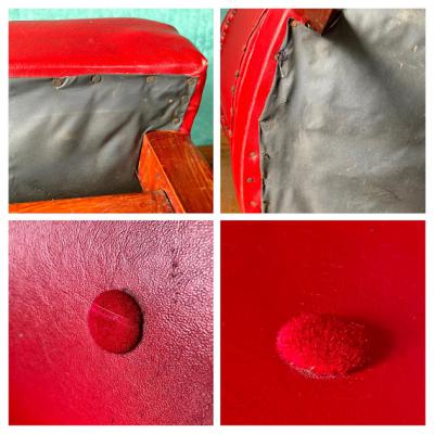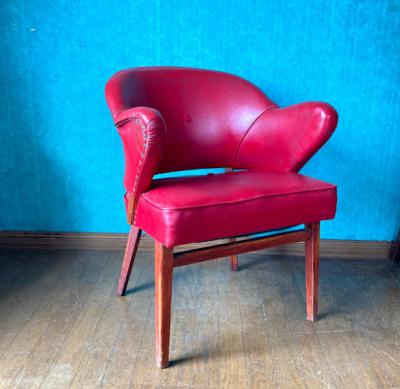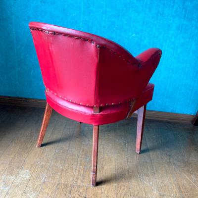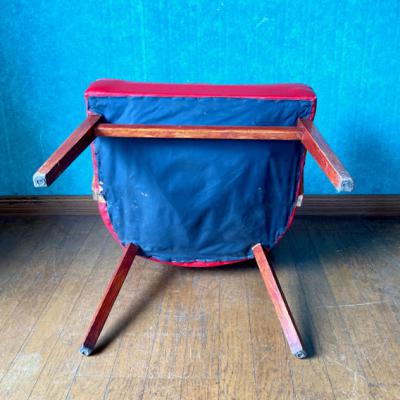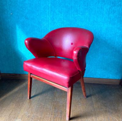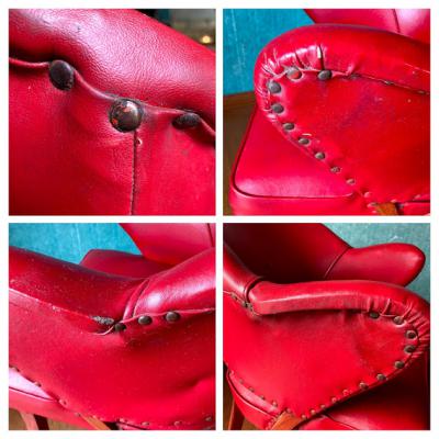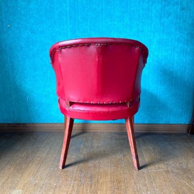 一度は憧れる鮮やかな赤が眩しい椅子です。推定1950年代。長い時代を経たものの持つ独特の風合いと、全体を鋲で固定してあるためイギリスらしいパンクな雰囲気も持ち合わせています。ひじ掛けがあるのでリラックスタイムにも良さそうですね。ひじ掛け部分に小さな破れ、底の部分にタッカーで補修したような跡がございました。背中と座面に丸いふわふわのくるみボタンのようなものが付いています。鋲の部分やカーブしている部分には塗装の剥がれが見られますが、これらがあることで時代を感じる雰囲気がより出ています。座りごごちは、やや柔らかめです。(感じ方には個人差があります。)ビンテージの持つ独特の雰囲気がお好きな方!赤い椅子にあこがれのある方!におすすめ。ビンテージのため写真には写り切れない小さな傷や凹凸などがある場合があります。ピカピカの新品をお求めの方はご遠慮ください。