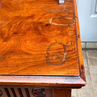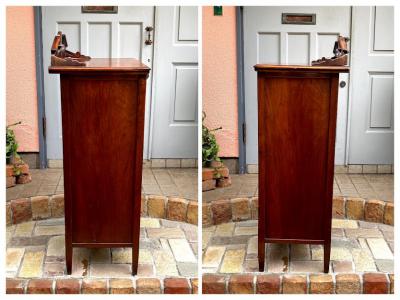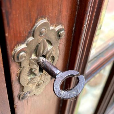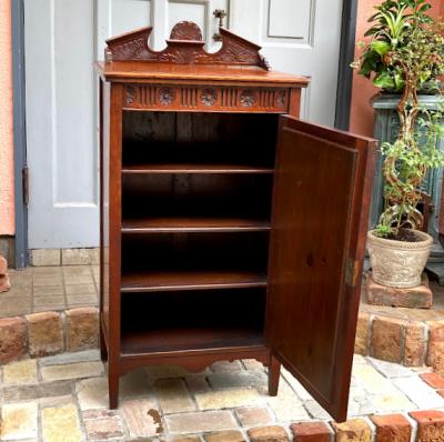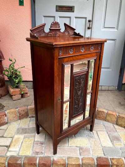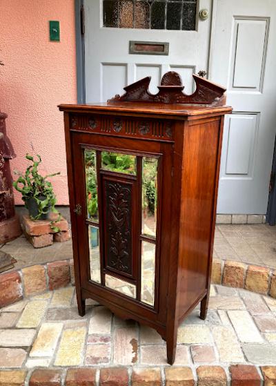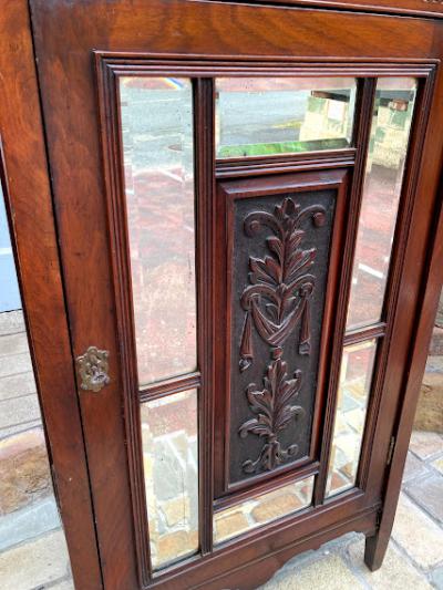 商品入れ替えのため値下げしました!推定1920年代、マホガニーのシルエットが美しいキャビネットです。レコード入れとして使用されていたとのこと。4つの棚はしっかりと固定されているため高さの変更はできません。同じ高さではなく、オーダーされたのか4段とも微妙に高さが違いました。小ぶりなサイズ感ですので、玄関や廊下などの狭いスペースでも有効活用できそうですね。古いお品のため表面に傷や補修の跡、前面の鏡はアンティークの特徴である黒いシミのようなものがございます。これらも含めて風合いとしてお楽しみいただければと思います。取っ手はありませんので、付属の小さな鍵で開閉を行います。鍵はスムーズにかかりました。レコード以外でも小物を収納したい方!シックなお部屋作りを楽しんでいる方!店舗什器をお探しの方!などにおすすめ。