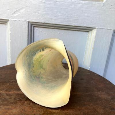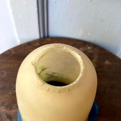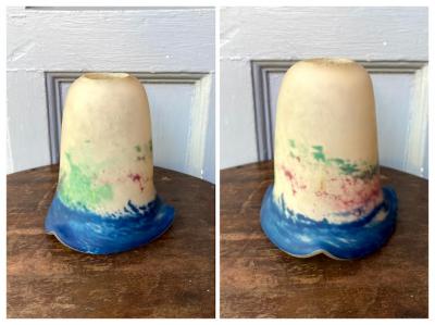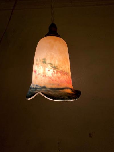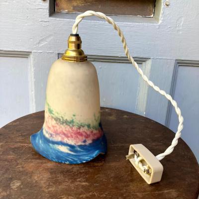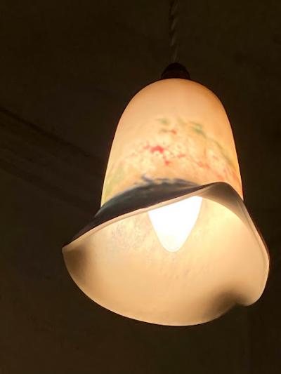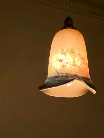 白と青に加え紫や緑などの色のお組み合わせて独特な色合いを見せてくれるペンダントライトです。花びらのように広がる部分は光を灯すと、なんとも言えない佇まいです。フランス製、年代不詳とのこと。シェード以外のコード・ソケット(口径:E17)・引っ掛けシーリング・お試し用電球(白熱球25W)は新しい物に交換してありますので、届いたその日から柔らかな光をお楽しみいただけますね。取り付ける電球の明るさにより見え方が違ってきます。大きな割れなどはありませんが、経年劣化による小さな傷などはございます。アールヌーボーの雰囲気を色濃く持ちあわせる照明となりますので、玄関や廊下、お店のアクセントとしても素敵ですね。コードの長さ(1mまでは無料で調整)・色(ブラウン・ゴールド・ホワイト・クリア)はご自宅に合わせてお好きに変更が可能です。特にご希望がない場合は写真に使用したものと同じものでお届けいたします。古いお品にご理解のある方、LED電球も使える照明でおしゃれなものをお探しの方におすすめ。ピカピカの新品をお求めの方はご遠慮ください。福岡市南区の店舗にてお渡しもできますのでお気軽にどうぞ!