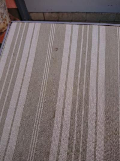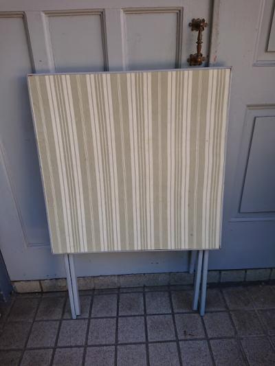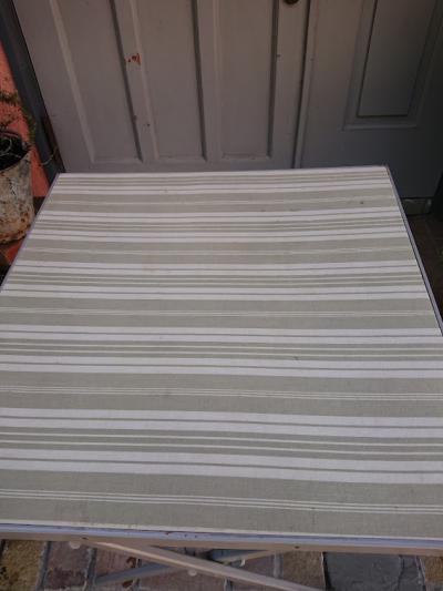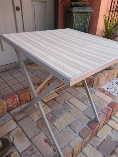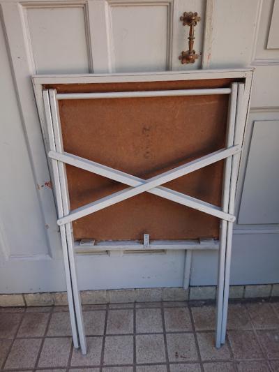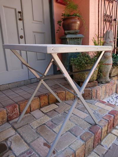 英国より入荷したゲームテーブルをグレーに塗装、天板にはビンテージのフランス生地を張ってあります。布地を使用していますので、室内もしくは晴れた日に屋外で使用するのに便利ですね。元々イギリスでカードゲームを楽しむことのできる階級の人々が、どこでもゲームを楽しめるように専用のテーブルとして作らせたとのこと。非常に軽く作られているため、持ち運びもラクラク、折り畳むと小さく収納ができ助かりますよ。屋外でのリフレッシュタイムにおすすめです。ベースは古いお品となりますので、小さな傷や汚れなどはございます。