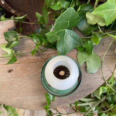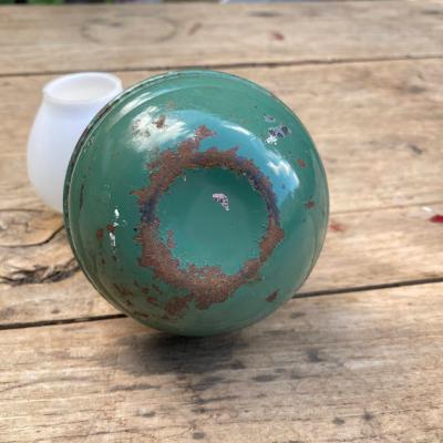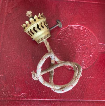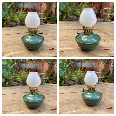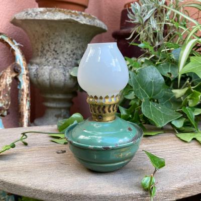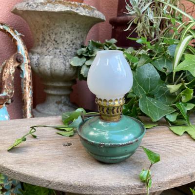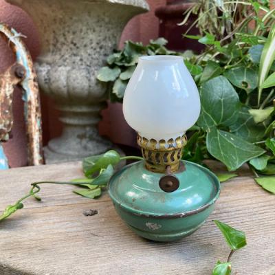 小さな約13㎝ほどの高さのオイルランプ。19世紀初頭から電気が普及し始めましたが、2階の部屋には電気配線の設置が遅く1960年代頃まではこのようなオイルランプやキャンドルが生活の明かりとして利用されていたそうです。底の方に砂のような重りが組み込まれており倒れにくい設計になっています。ガラス部分に大きな割れなどはありませんが、側面にサビや傷、塗装の剥がれがございます。時代を感じる雰囲気のお品が好きな方におすすめ。