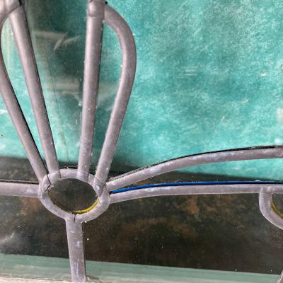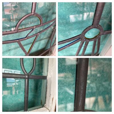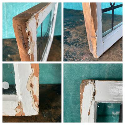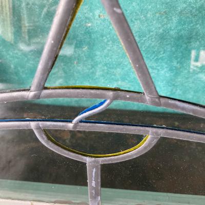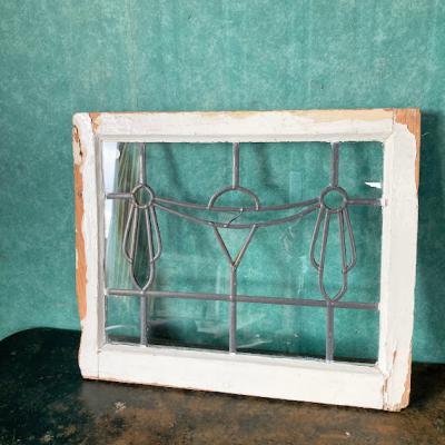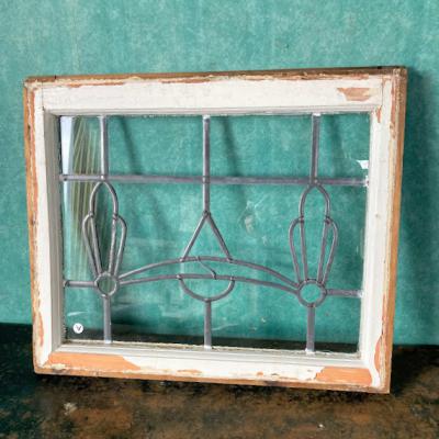 透明の一枚ガラス表面に鉛の線でデザインを作ったものとなります。近代ではこのような工法で作られたガラスも多数あるとのこと。そのためお求めやすい価格になっています。以前は一部のデザイン部分に特殊なシートを入れ込んであったようですが、すべて取り外してあります。遠目で見るとほとんどわかりませんが、至近距離でよく見ると以前使われていたブルーやイエローの色が見えます。無理にはがそうとすると鉛の部分が外れてしまう恐れがあるためそのままにしています。周りの木枠は取り付けられていたままのものとなりますので、ペンキの剥がれや一部割れが見られます。まっさらのガラスでなくデザイン性のあるガラスをお探しの方におすすめ。幾何学的な模様のため上下どちらでもお好きな柄で設置でします。ピカピカの新品をお求めの方はご遠慮ください。お店やお部屋のアクセントとして素敵な窓となります。取り付けにつきましてはご自身の契約されている施工業者さまにお問合せください。福岡市南区の店舗にてお渡しもできますのでお気軽にどうぞ!同じデザインの物が3点ありますが微妙にサイズが違います。こちらは【A】です。