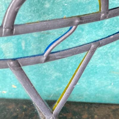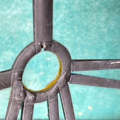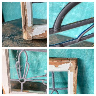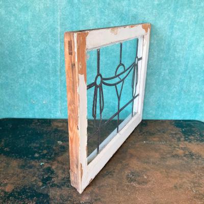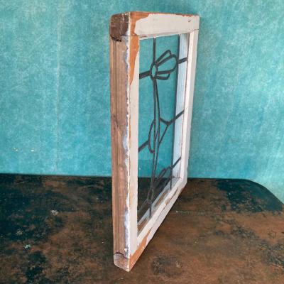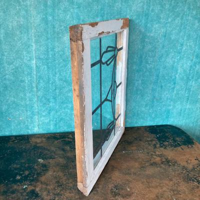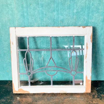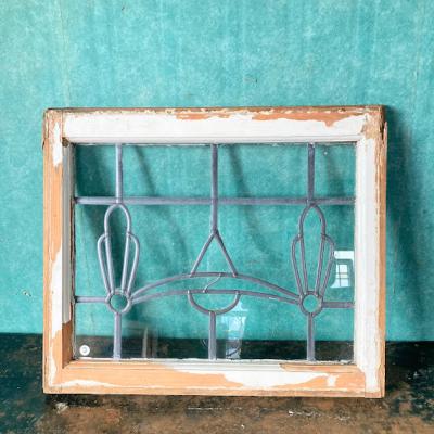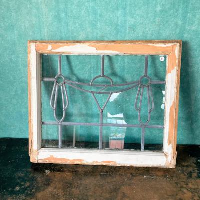 透明の一枚ガラス表面に鉛の線でデザインを作ったものとなります。近代ではこのような工法で作られたガラスも多数あるとのこと。そのためお求めやすい価格になっています。以前は一部のデザイン部分に特殊なシートを入れ込んであったようですが、すべて取り外してあります。遠目で見るとほとんどわかりませんが、至近距離でよく見ると以前使われていたブルーやイエローの色が見えます。無理にはがそうとすると鉛の部分が外れてしまう恐れがあるためそのままにしています。周りの木枠は取り付けられていたままのものとなりますので、ペンキの剥がれや一部割れが見られます。まっさらのガラスでなくデザイン性のあるお手頃なガラスをお探しの方におすすめ。幾何学的な模様のため上下どちらでもお好きな柄で設置でします。ピカピカの新品をお求めの方はご遠慮ください。お店やお部屋のアクセントとして素敵な窓となります。取り付けにつきましてはご自身の契約されている施工業者さまにお問合せください。福岡市南区の店舗にてお渡しもできますのでお気軽にどうぞ!同じデザインの物が3点ありますが微妙にサイズが違います。こちらは【C】です。