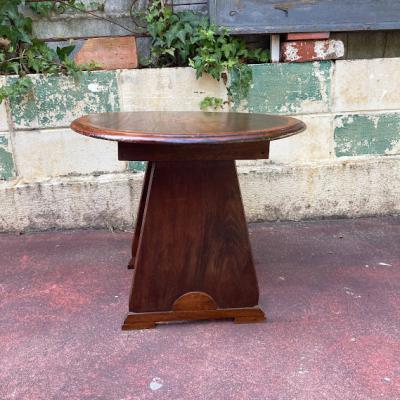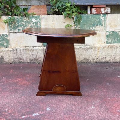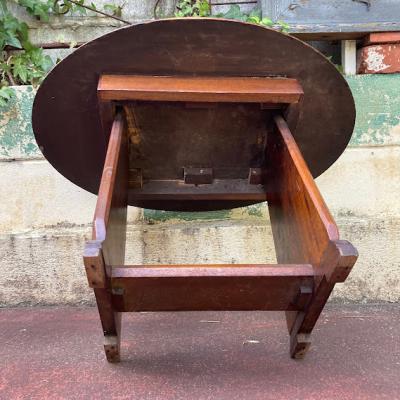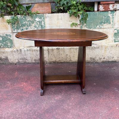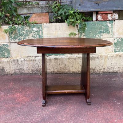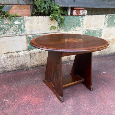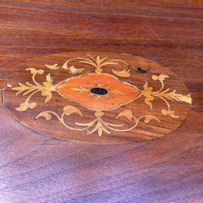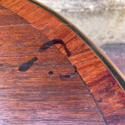 中央にインレイ(木工象嵌)の可愛らしい模様を施したローテーブルです。楕円形で小ぶりなサイズ感ですので、ソファにも床に座ってお茶を飲むのにも便利そうですね。店舗などでは展示台の上に乗せてディスプレイ台としても使えそうです。古いお品となりますので、小さな傷や凹凸などはございます。古いものがお好きな方、傷もアンティークの風合いとしてお楽しみいただける方におすすめ。ピカピカの新品をお求めの方はご遠慮ください。福岡市南区の店舗にてお渡しもできますのでお気軽にどうぞ!
