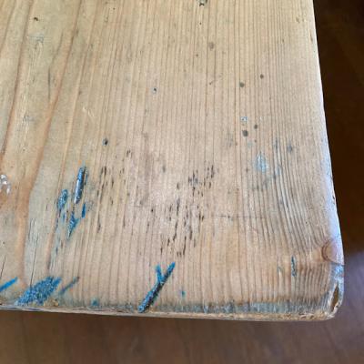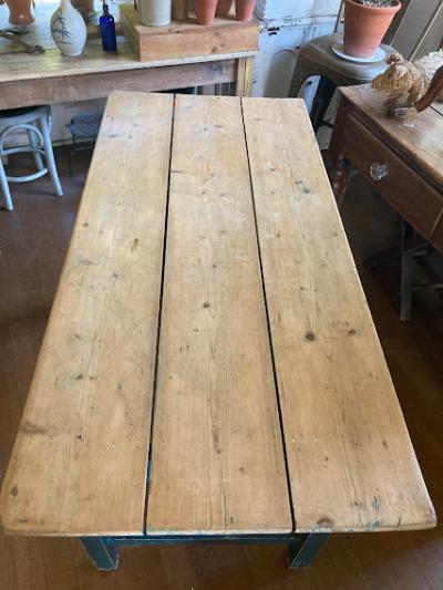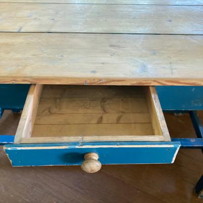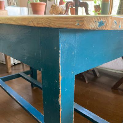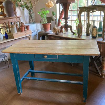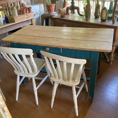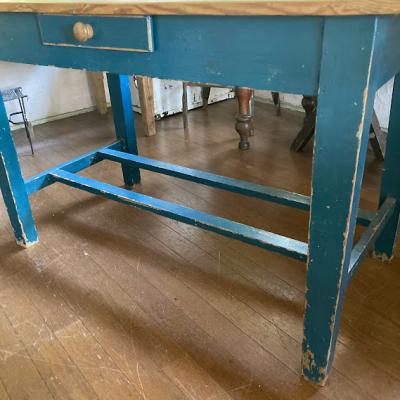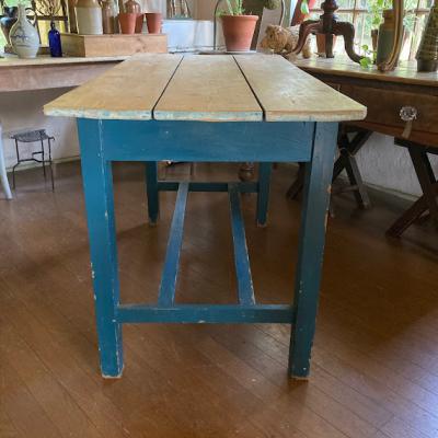 脚を鮮やかなブルー系にペイントしたパインテーブル。がたつきやぐらつきもなくしっかりとした作りになっています。小さな引き出しも付属しているので、小物の収納に便利ですね。一般的なサイズの椅子が4脚入りますので、小さめのダイニングテーブや、天板の広さを生かして作業台などにもおすすめです。古いお品のため経年による擦り傷、ペイントのはがれがあります。古いものの持つ雰囲気がお好きな方へ。ピカピカの新品をお求めの方はご遠慮ください。