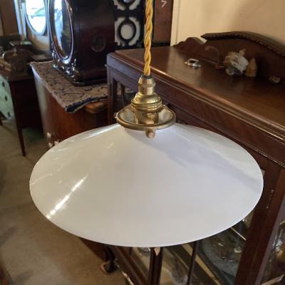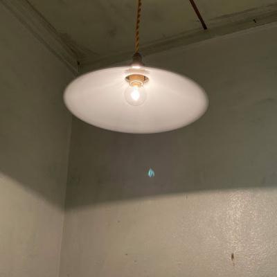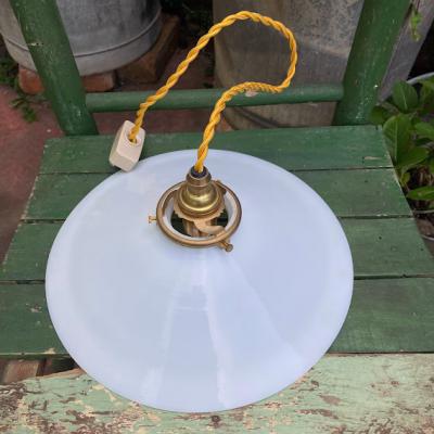 フランス製。一つひとつ手作りの白いガラスで作られたシンプルな形のペンダントライト【S】です。こちらはすぐにご利用ができるように、引っ掛けシーリング・コード・お試し用の電球(25W)を付属します。写真の電球は口金E17サイズの25W(ボール球・クリア)を使用していますが、市販のLED電球も使用できます。コードの長さは店舗用に約50㎝ほどでご準備しておりますが、お部屋の雰囲気に合わせて、ゴールド・ホワイト・ブラウン・クリアの色と長さをお選びいただけます。長さ調整は1mまでは無料で調整いたしますが、1m以上は追加で料金が発生しますので、事前にお問合せください。推定1930年~40代頃のお品となりますので、細かな傷や落ちきれない汚れがある場合がございます。古いものが好き!外国のようなお部屋作りを楽しんでいる!ピカピカの新品よりはレトロな雰囲気のものが好き!という方におすすめです。ピカピカの新品をお求めの方はご遠慮ください。福岡市南区の店舗にてお渡しもできますのでお気軽にどうぞ!