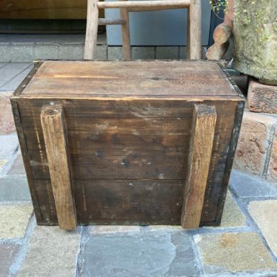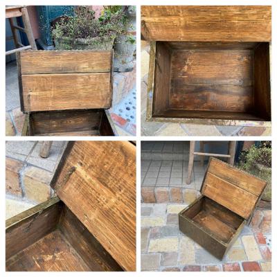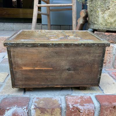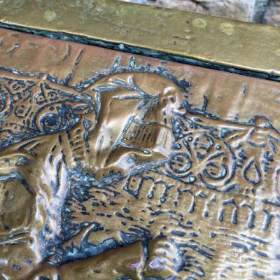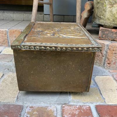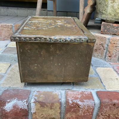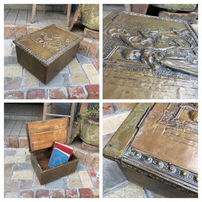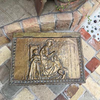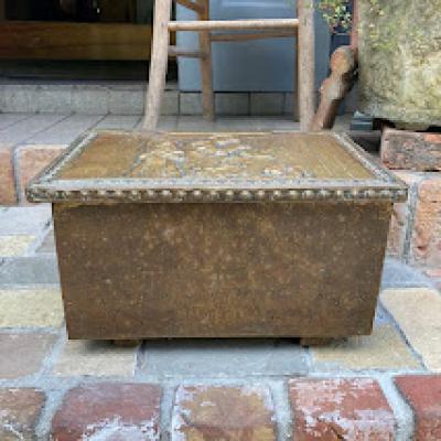 木製の箱に真鍮の美しい装飾を施した蓋つきの箱です。女性が裁縫をする横で小さな子供達が遊ぶ様子が描かれています。玄関でスリッパや小物を収納したり、大事なコレクションを入れてもいいですね。背面と底には真鍮の装飾はありません。元々のデザインなのかわかりませんが、女性の顔の部分と右下の子供の部分が一部凹んでいるようにも見られます。当店ではあえてピカピカには磨き上げておりませんので、経年劣化の少しくすんだような風合いのままにしてあります。古い道具に興味がある方、雰囲気のある収納をお探しの方におすすめ。