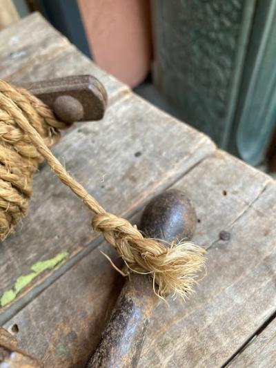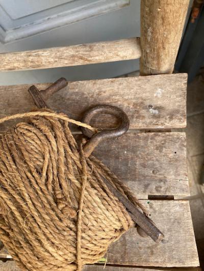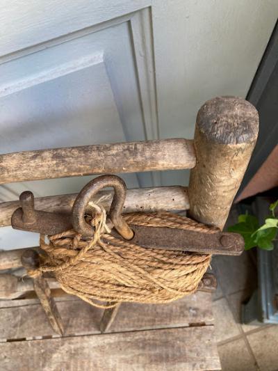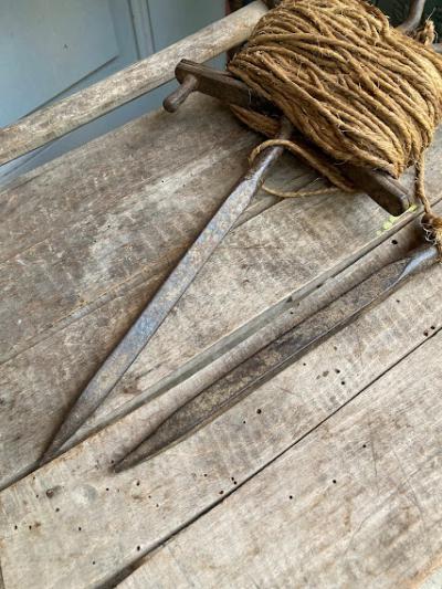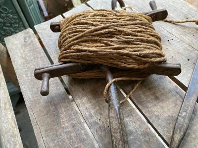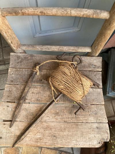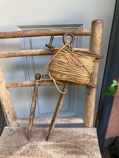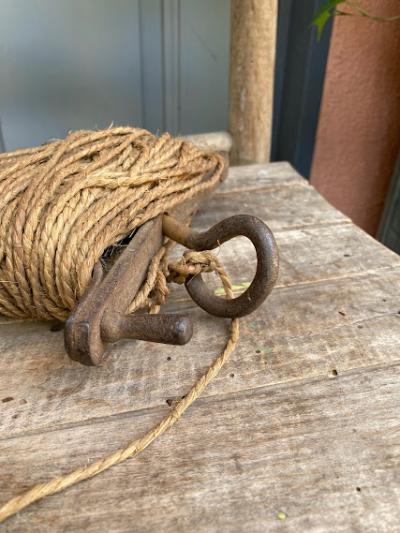 昔の建物を建てる時に測量や水平を測ったりするための紐が付いたアイアンの道具です。元の状態に戻せる自信がなかったので紐の長さは測っておりません。紐の巻き付いたパーツと、杭を2つペアで使っていたそう。このような生活に密着していたものはあまりないので面白いですね。経年劣化により艶やかなアイアンの姿が印象深いお品となります。グリーンとの相性が良いのでガーデニングのオブジェとして、レトロなお部屋作りのアイテムとしておすすめ。写真の通りサビ、紐の劣化などはございます。ジャンクな雰囲気がお好きな方向き。