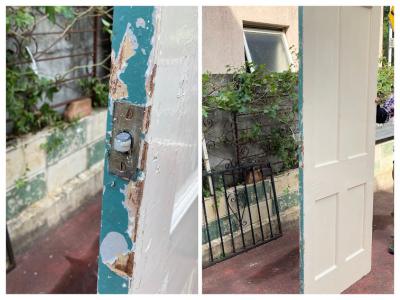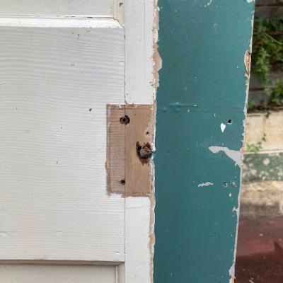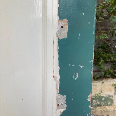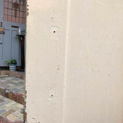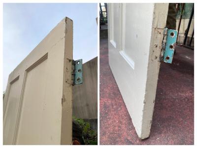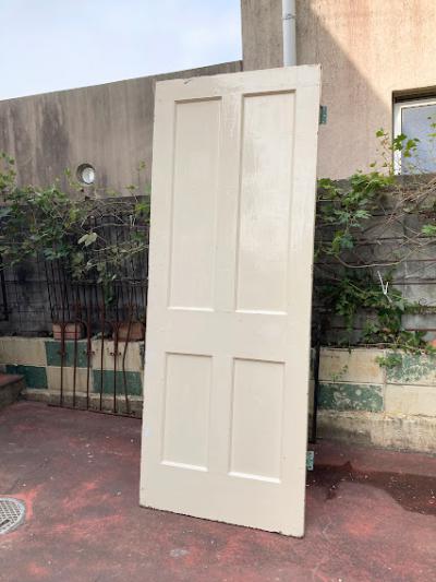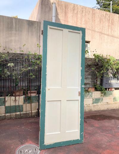 イギリスでは家の持ち主がそれぞれ好きな色にペイントを行っています。こちらはシンプルな古いパインのドアにホワイトとエメラルドグリーンをダイナミックにペイントしたもの。コントラストが素敵な風合いです。ドアノブや鍵は付属していません。小さな穴が多数開いているため上からお好きな色に上からペイントしても面白いですね。上下2か所古い丁番あり、室内用のドア向き。現状のままのお渡しです。日本の規格のサイズではありませんので、取り付けにつきましてはご自身の契約されている施工業者さまにお問合せください。福岡市中心部はお店から配達できますが、それ以外の地域はヤマト家財便の利用となります。予めご了承ください。
