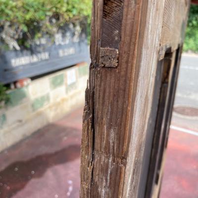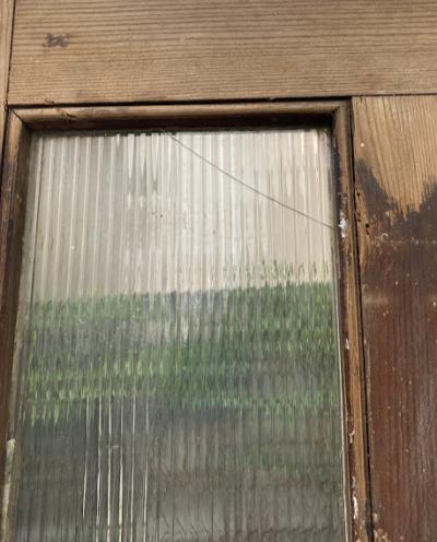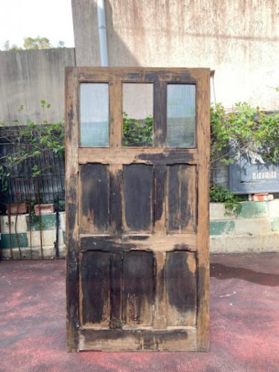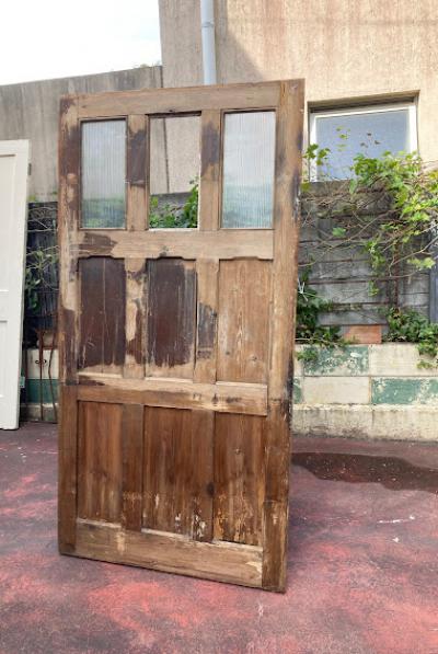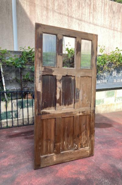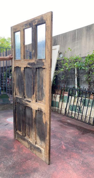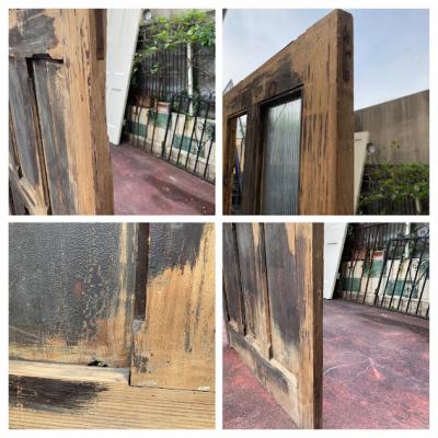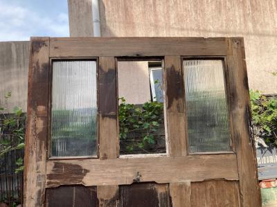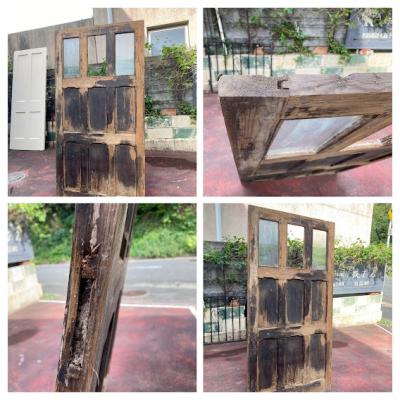 ガラスをはめ込んだ素朴な佇まいのドア。少し低めの高さと少し横が広い印象なので、普通とは違う雰囲気を作りたい方におすすめのタイプです。ノブ・鍵などは付属しておらず、上部ガラスの真ん中1枚はありません。片方のガラスにもヒビが入っているため、お好きなガラスへと変更したりオリジナルのデザインの物をはめ込むなど楽しみが広がります。換気などを考慮し、あえてガラスを全部抜いても面白いかもしれませんね。現状お渡しとなります。日本の規格のサイズではありませんので、取り付けにつきましてはご自身の契約されている施工業者さまにお問合せください。福岡市中心部はお店から配達できますが、それ以外の地域はヤマト家財便の利用となります。予めご了承ください。